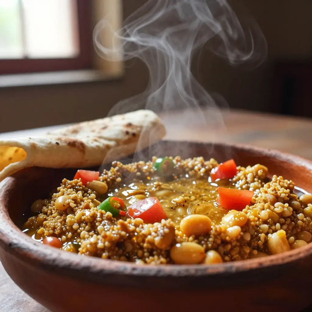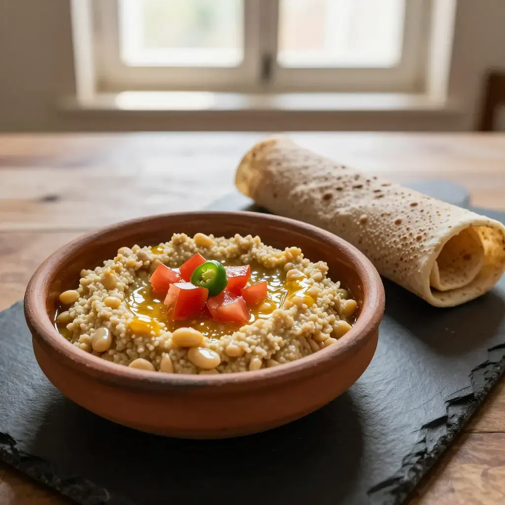 Ful medames — slow-cooked fava beans mashed with spiced butter, onion, and fresh tomato — is the great communal breakfast of Ethiopia and Eritrea, eaten with injera or crusty bread across every social class. Dating back centuries along the Nile valley trade routes, it remains the most widely eaten morning meal in the Horn of Africa. The Ethiopian version is distinguished by niter kibbeh and berbere giving it a warmth unlike any other iteration.