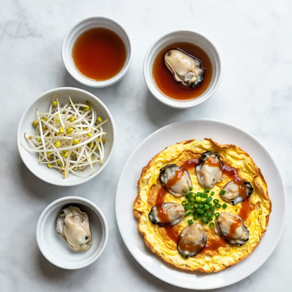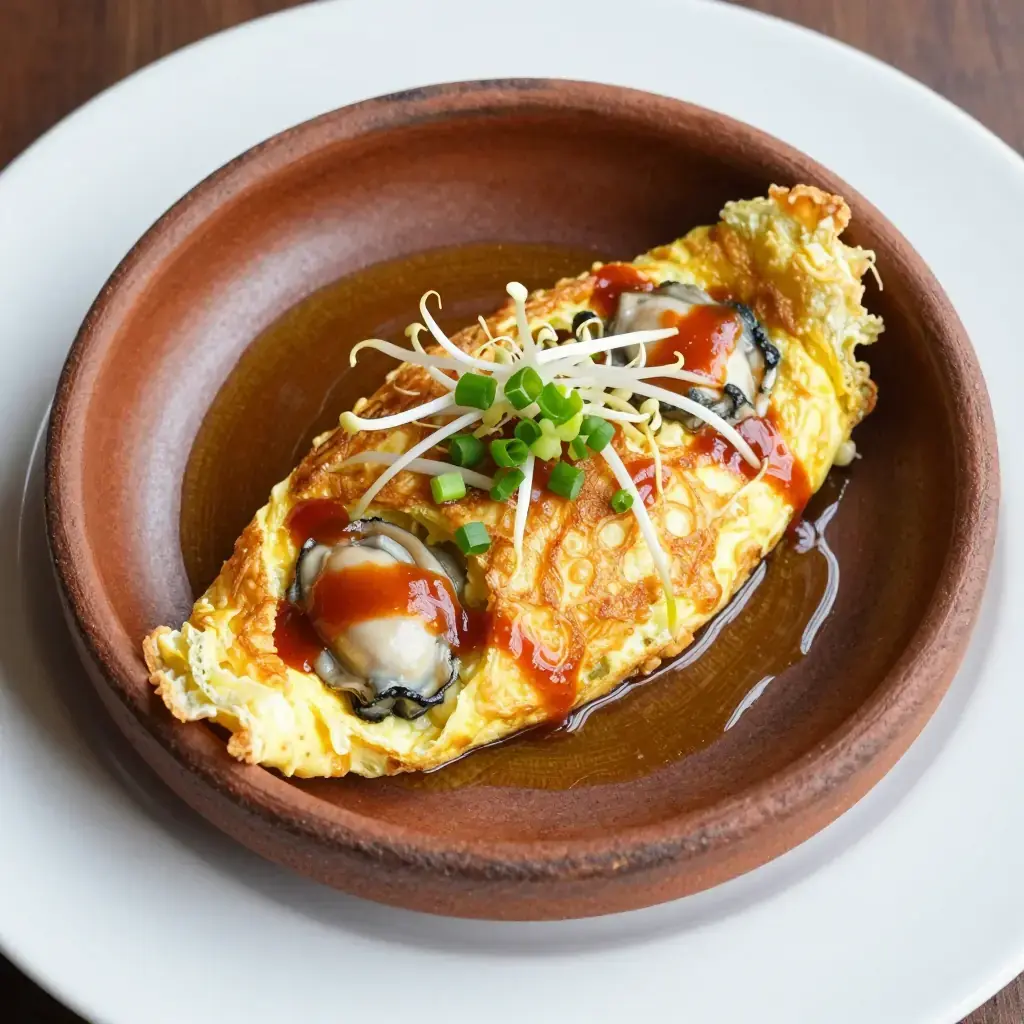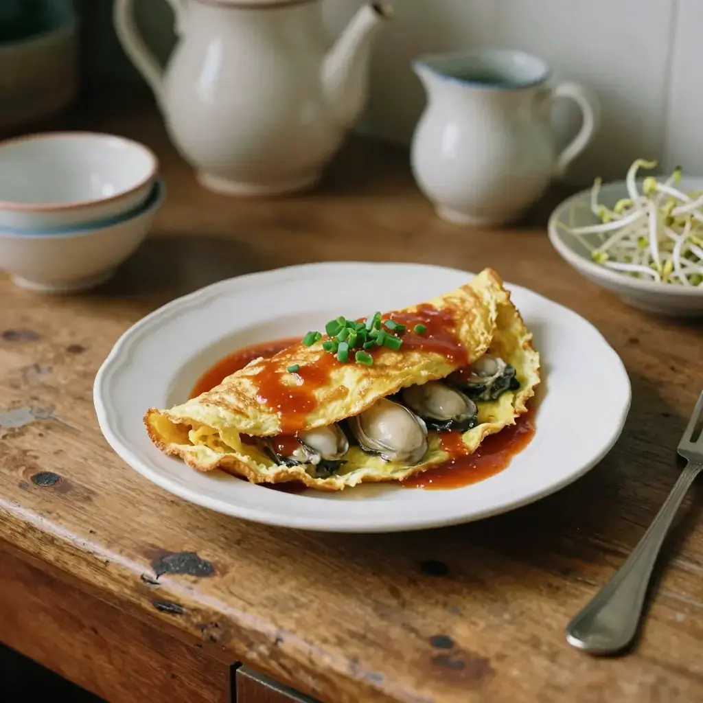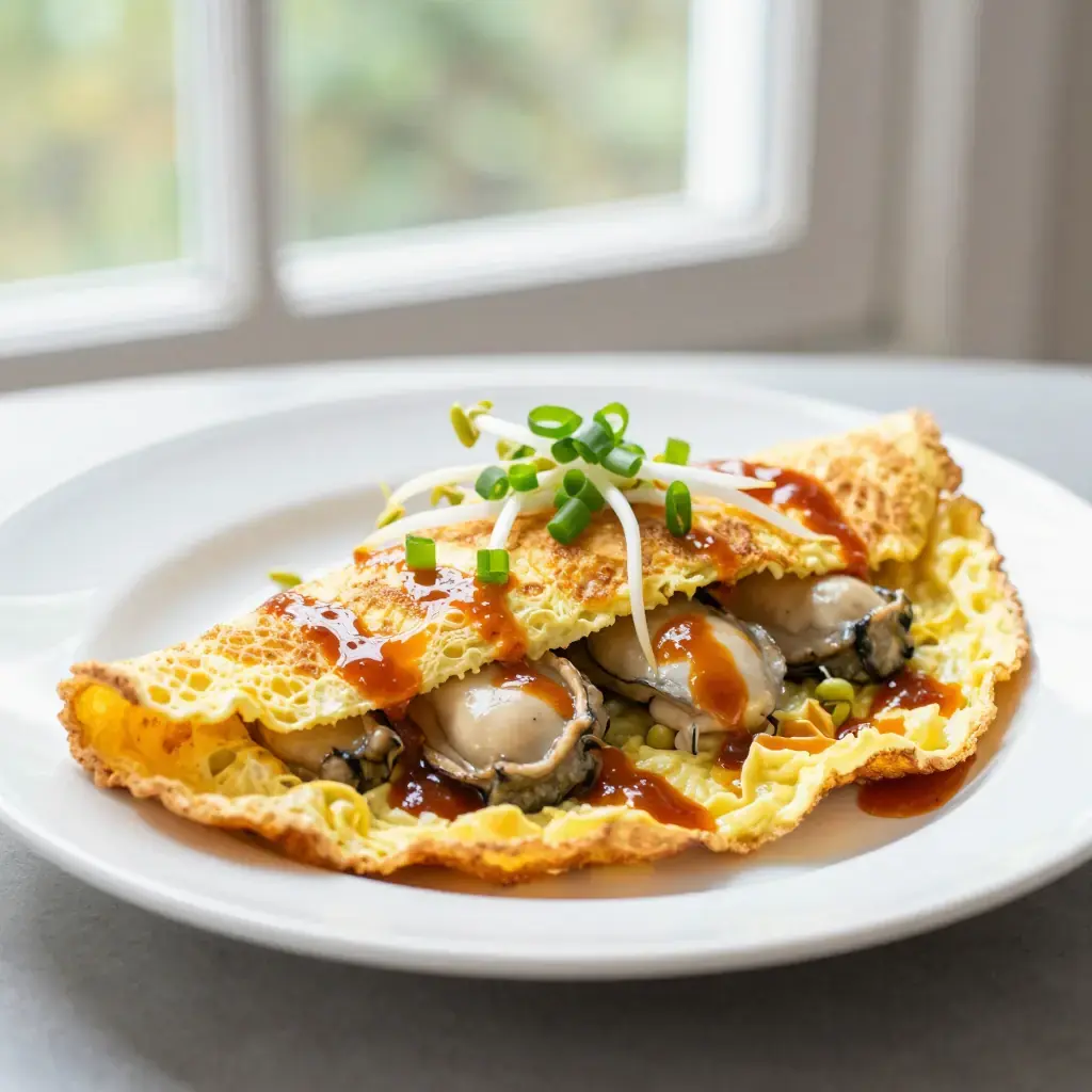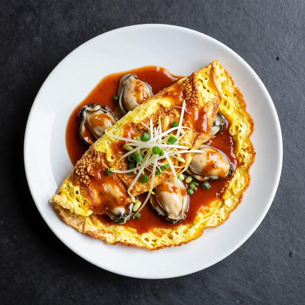 Hai Li Jian is one of the most beloved street foods of coastal Fujian and Taiwan. Fat local oysters are folded into a batter of sweet potato starch and egg, then pan-fried in lard until the edges turn lacy and crisp while the centre remains soft and custardy. A tangy house sauce — sweet chilli or a garlic-ketchup blend — is drizzled over before serving.
