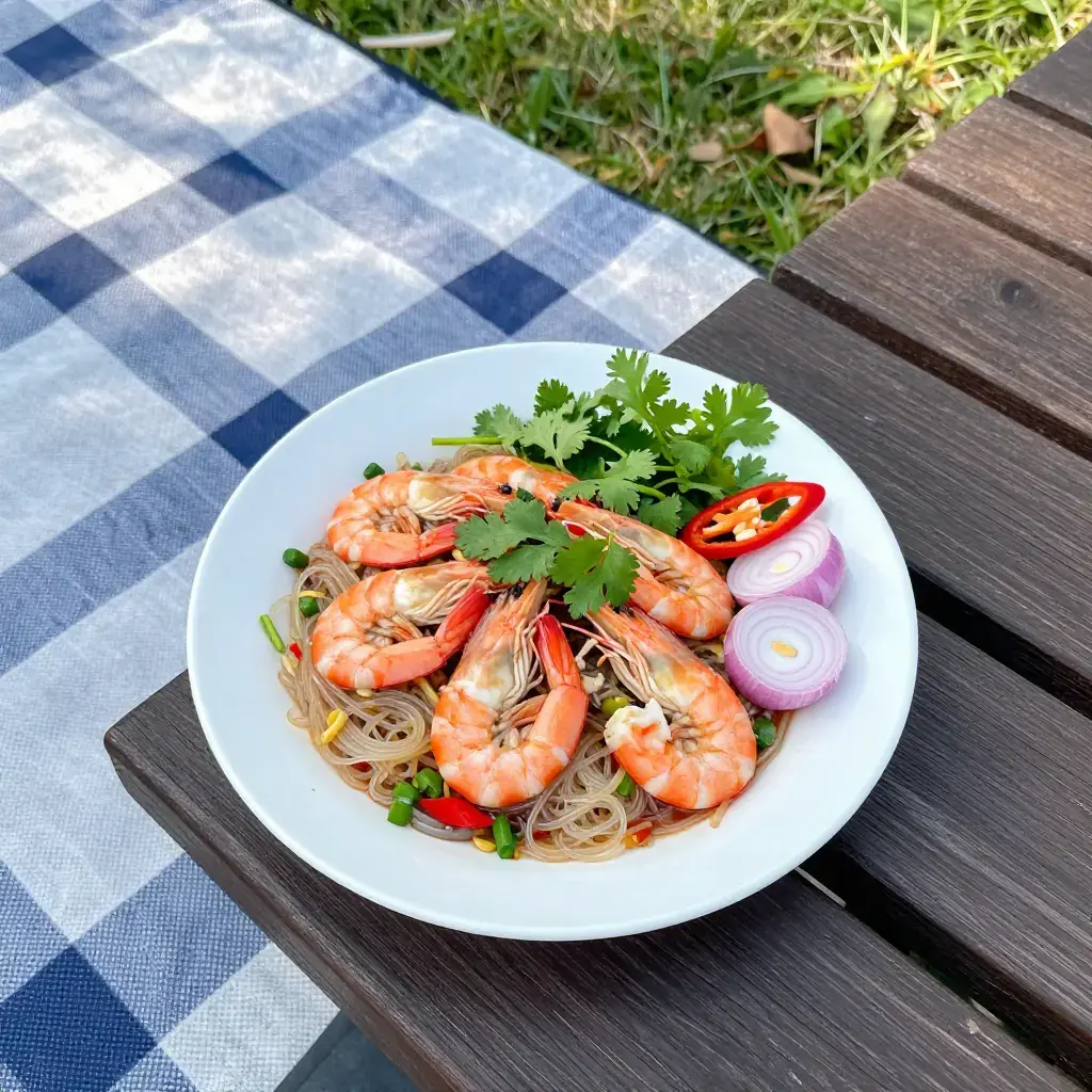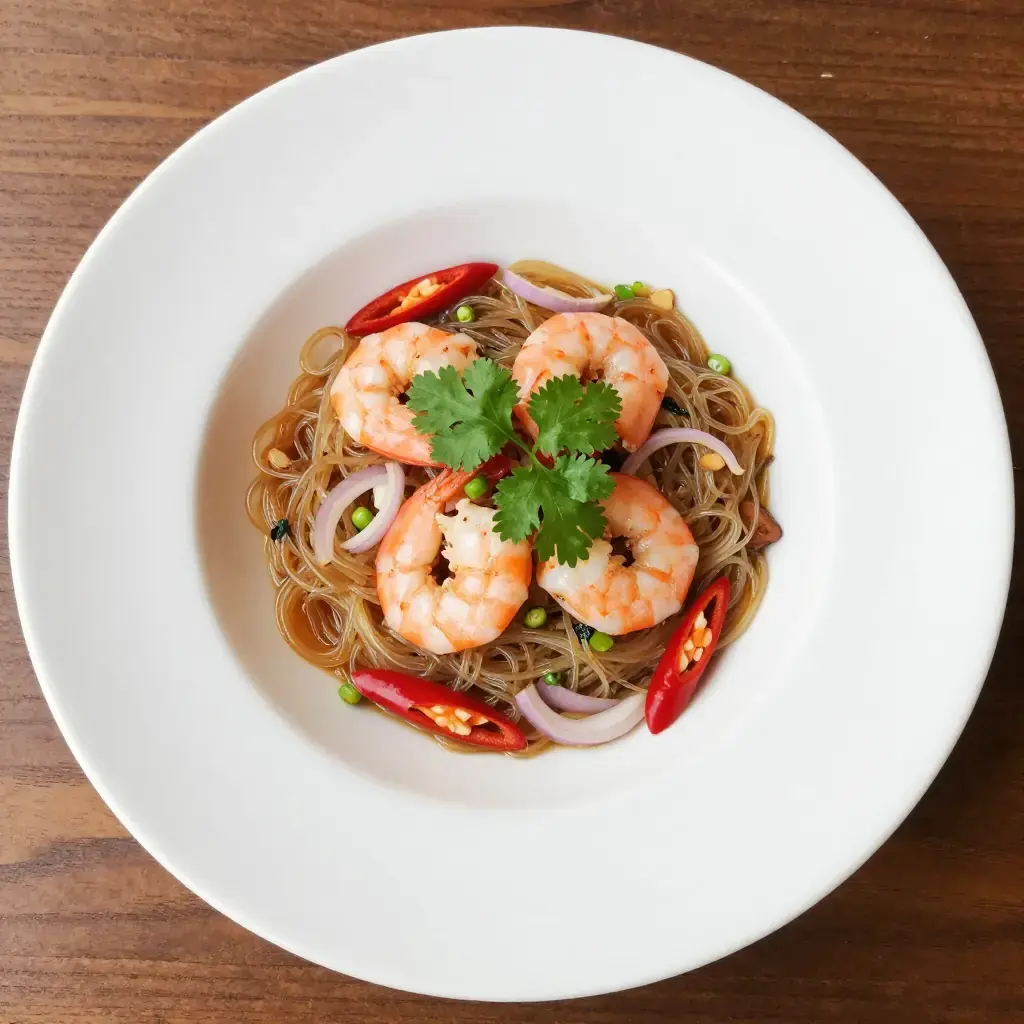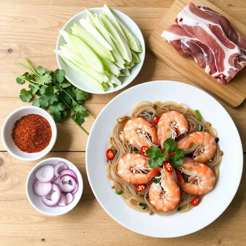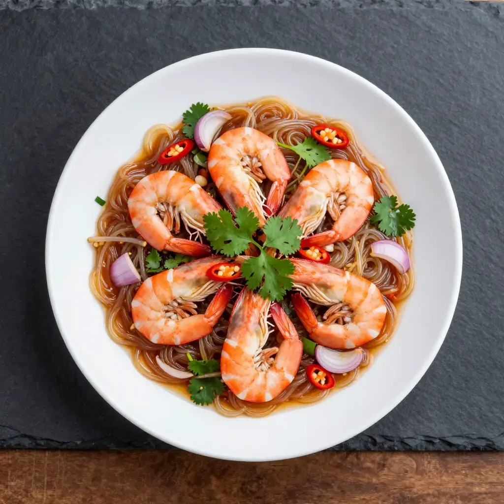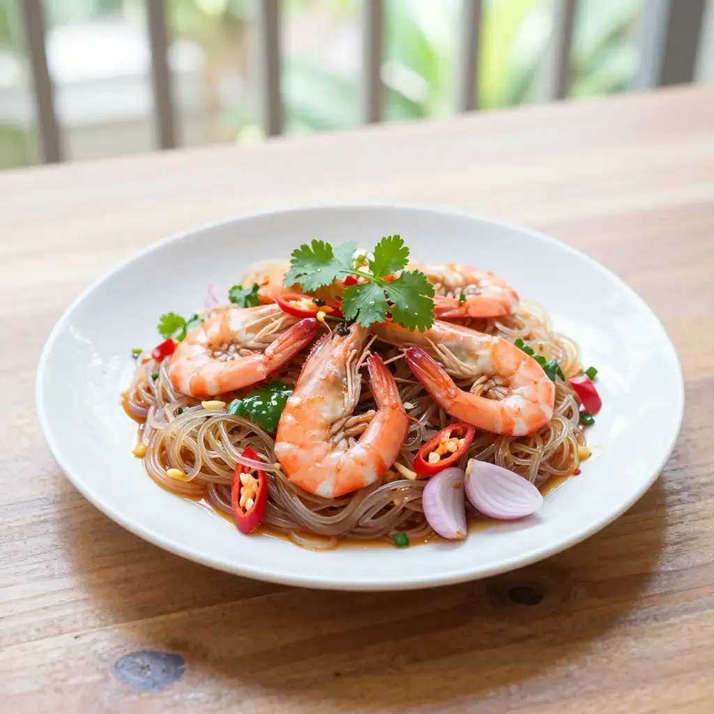 Yam Woon Sen is a lively Thai salad built on silky glass noodles tangled with prawns, minced pork, and a punchy lime-fish sauce dressing. Sold at every Thai market stall, it is prized equally as a quick weekday lunch and a vibrant dish to bring to a shared table — it travels well and tastes even better at room temperature.