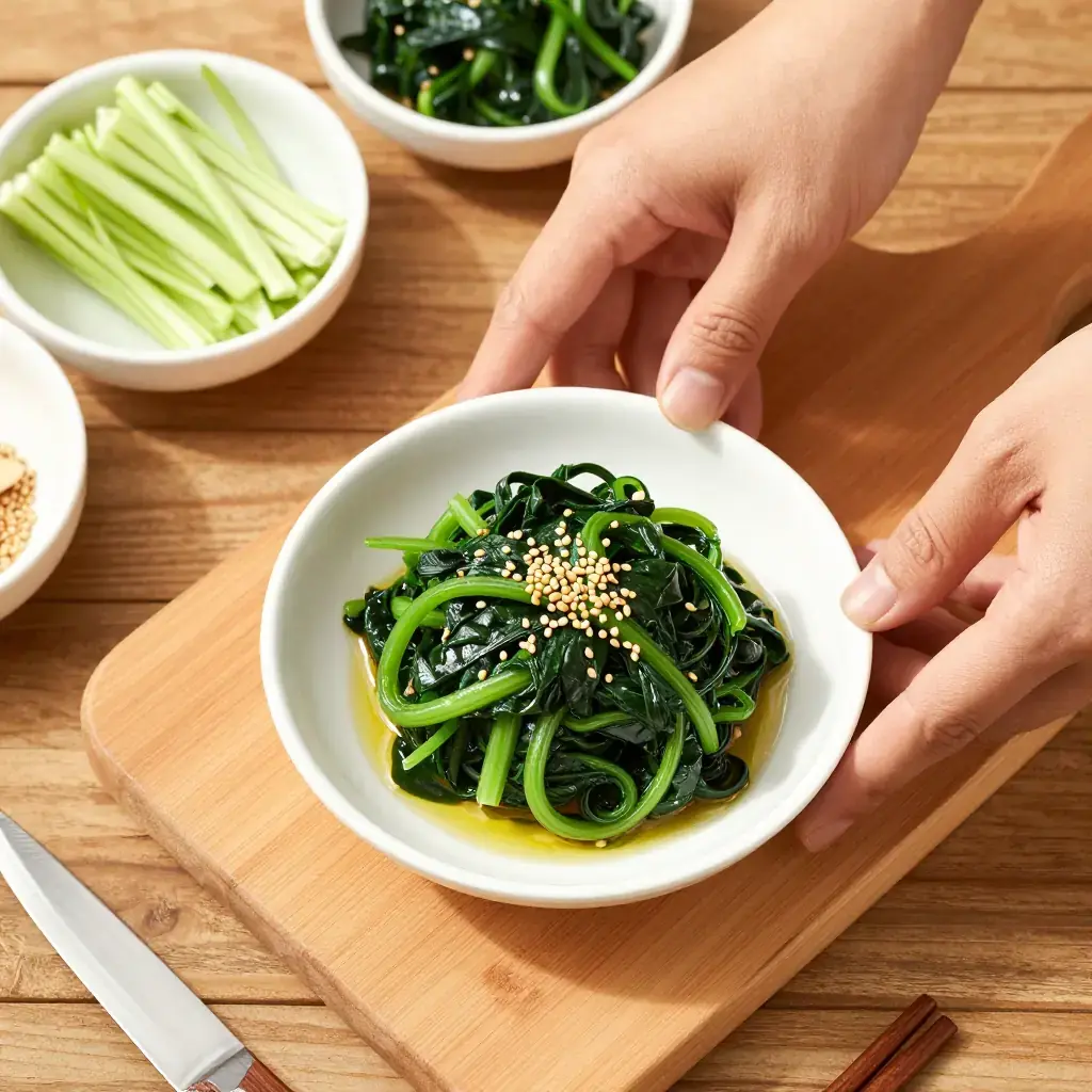 Cook's Notes: Squeezing the spinach very dry is essential — a watery namul becomes soggy and bland. Sigeumchi Namul keeps refrigerated for up to 3 days; bring to room temperature before serving. A small pinch of sugar is optional but rounds out the flavour beautifully.