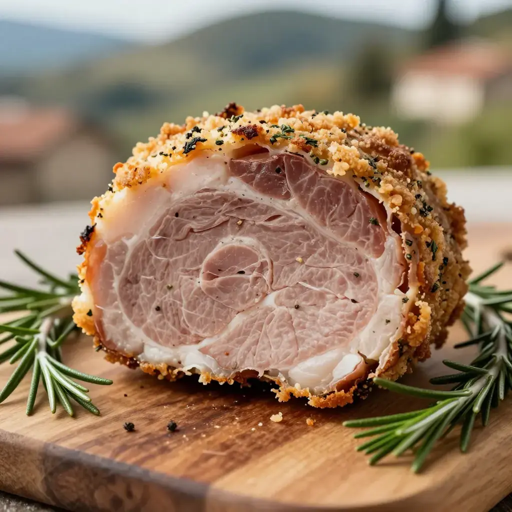 # Porchetta di Ariccia Ariccia, a small hill town south of Rome in the Castelli Romani, is the undisputed capital of porchetta — a whole deboned pig rolled with wild fennel fronds, rosemary, garlic, and black pepper, then roasted until the skin crackles like glass. Since the 16th century, vendors have sold it from wooden carts; today it is still sliced thick and eaten in a bread roll at village festivals across Lazio. Serves: 12 ## Ingredients **For the pork:** - 3 kg (6.6 lb) boneless pork belly with skin, scored in a crosshatch pattern - 500 g (1.1 lb) pork loin, butterflied open **For the stuffing:** - 6 garlic cloves, minced - 4 tbsp (60 ml) extra-virgin olive oil - 3 tbsp fresh rosemary, finely chopped - 4 tbsp wild fennel fronds or 2 tsp fennel seeds, lightly crushed - 1.5 tsp (8 g) coarse sea salt - 2 tsp (6 g) coarsely ground black pepper - 0.5 tsp chilli flakes ## Instructions 1. The day before: combine all stuffing ingredients into a paste. Lay pork belly skin-side down. Place butterflied loin on the belly. Spread the herb paste aggressively over the meat surfaces. 2. Roll the belly tightly around the loin, skin side out. Tie with kitchen twine at 3 cm (1.25 in) intervals. Refrigerate uncovered overnight to dry the skin — this is essential for crackling. 3. Remove from fridge 1 hour before cooking. Preheat oven to 230°C (450°F). 4. Roast on a rack at 230°C for 30 minutes until the skin begins to blister and crackle. 5. Reduce heat to 160°C (325°F) and roast a further 2–2.5 hours until internal temperature reaches 70°C (160°F). 6. Rest uncovered 30 minutes before slicing thickly. The crackling should shatter when tapped. **Cook's Notes:** Do not cover the porchetta while resting — steam will soften the crackling. If the skin has not fully crackled, blast under the grill (broiler) for 3–5 minutes at the end. Leftovers are superb cold in sandwiches the next day.Images