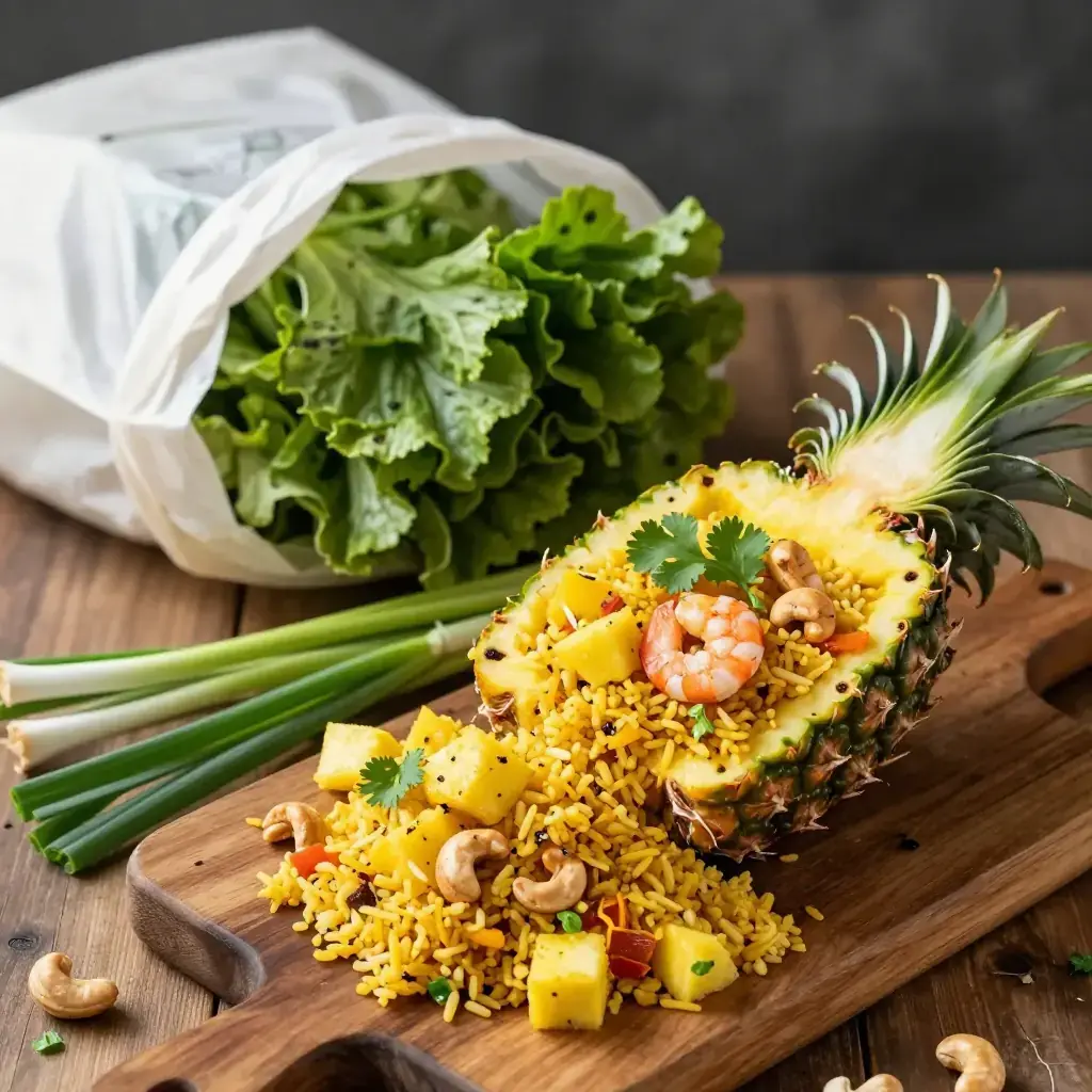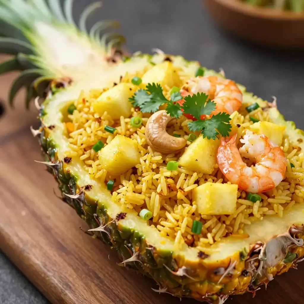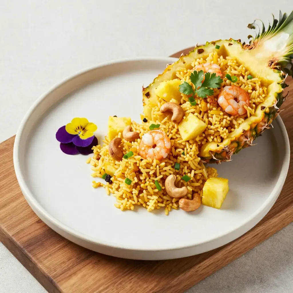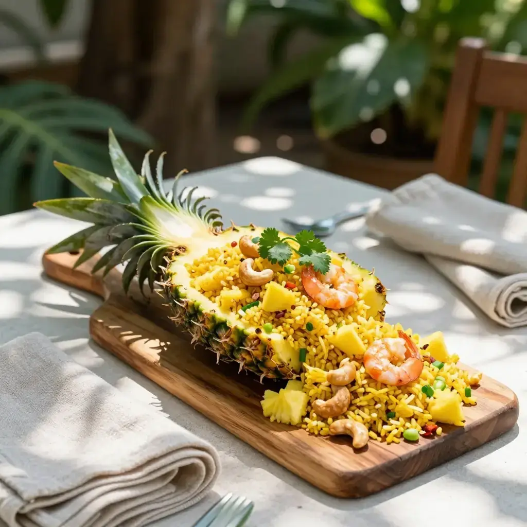 Khao pad sapparod is Thailand's showstopping pineapple fried rice, traditionally served inside a halved pineapple shell at street stalls and restaurants throughout the country. Jasmine rice stir-fried with sweet fresh pineapple, cashews, and golden raisins gets its distinctive savouriness from fish sauce and a touch of curry powder — a legacy of Indian spice trade influence.