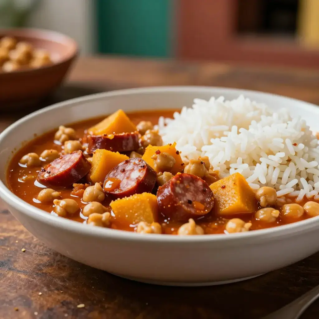 - Add the sofrito, chorizo, calabaza, and bay leaves to the chickpea pot. Stir to combine. Continue simmering uncovered for 30–40 minutes until chickpeas are very tender and the broth has thickened to a rich, stew-like consistency. The calabaza will partially dissolve, adding body and sweetness.