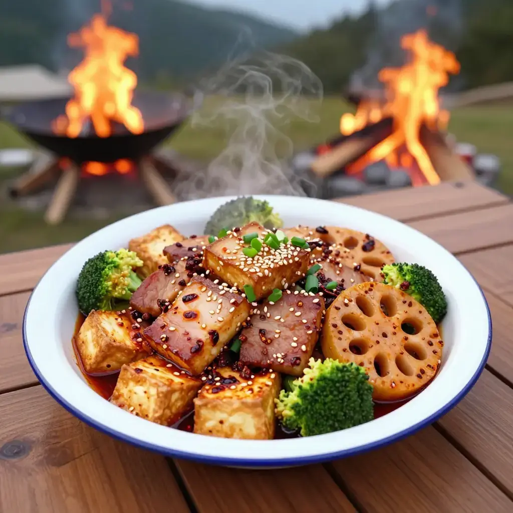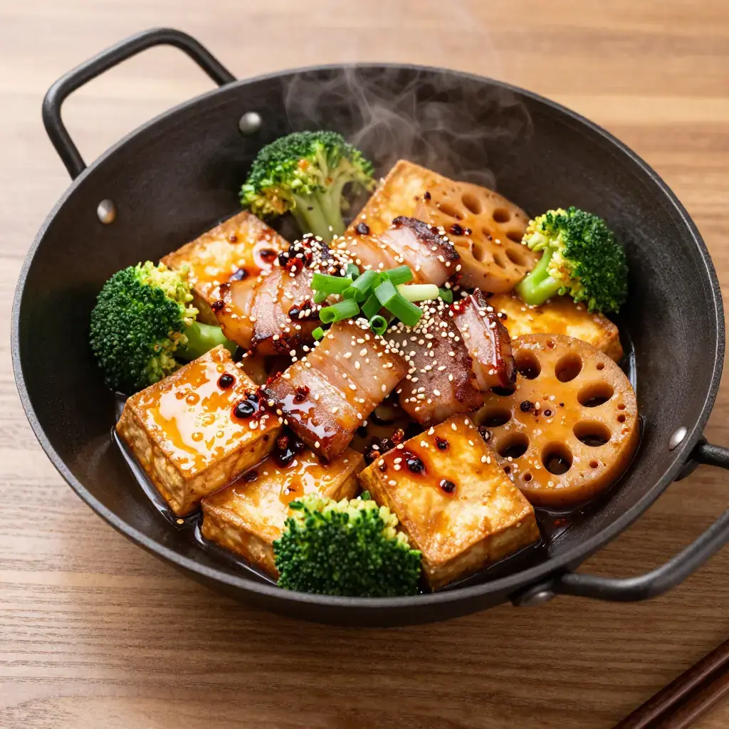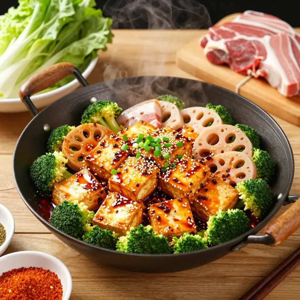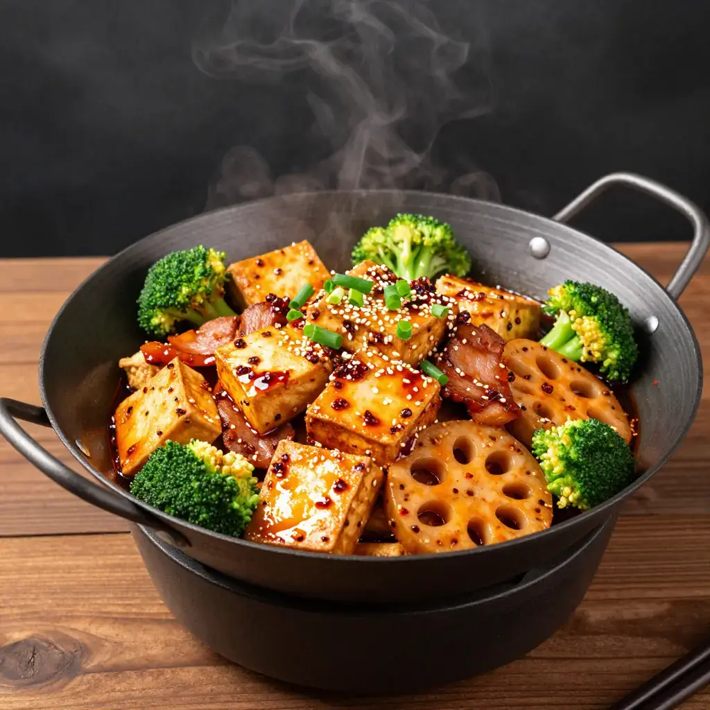 # Sichuan Mala Xiang Guo Mala Xiang Guo is Chengdu's beloved late-night stir-fry where diners select raw ingredients — vegetables, meats, tofu, and offal — which are then wok-tossed to order in a blazing bath of dried chillis, Sichuan peppercorns, and fermented black bean paste. Unlike its cousin hotpot, the xiang guo is dry-tossed, concentrating the mala (numbing-spicy) flavour into a rich, glossy coating on every piece. Serves: 4 ## Ingredients - 200g (7 oz) firm tofu, cut into 3 cm cubes - 150g (5 oz) thinly sliced pork belly - 100g (3.5 oz) lotus root, sliced 5 mm thick - 100g (3.5 oz) wood-ear mushrooms, torn - 2 stalks celery, cut into 4 cm pieces - 1 small head broccoli, broken into florets, blanched 1 minute - 6 dried er jing tiao chillis, snipped - 1 tbsp (15 ml) Sichuan peppercorns, dry-toasted - 2 tbsp (30 ml) doubanjiang (Pixian fermented broad-bean paste) - 1 tbsp (15 ml) fermented black beans (douchi), rinsed and roughly chopped - 4 cloves garlic, sliced - 3 cm knob fresh ginger, julienned - 2 spring onions, cut into 3 cm sections - 3 tbsp (45 ml) neutral oil - 1 tbsp (15 ml) light soy sauce - 1 tsp (5 ml) sugar - 1 tsp (5 ml) sesame oil - Toasted sesame seeds, to finish ## Instructions 1. Press tofu between paper towels for 10 minutes, then pan-fry in 1 tbsp oil over high heat, turning every 2 minutes, until golden on all sides (8 minutes total). Remove and set aside. 2. Heat remaining oil in a wok over the highest flame until smoking. Add pork belly and stir-fry 2–3 minutes until the fat renders and edges brown. Remove and set aside. 3. In the same wok, fry dried chillis and Sichuan peppercorns 30 seconds until fragrant. Add doubanjiang and douchi; stir-fry 1–2 minutes until the oil turns brick-red and fragrant. 4. Add garlic, ginger, and spring onion whites; toss 30 seconds. Add lotus root and wood-ear mushrooms; stir-fry 3 minutes over high heat. 5. Return tofu and pork belly to the wok. Add celery and broccoli. Season with soy sauce and sugar; toss everything vigorously for 2 minutes until each piece is coated in the scarlet sauce. 6. Drizzle sesame oil, scatter spring onion greens and sesame seeds, and serve immediately from the wok. **Cook's Notes:** The secret is wok hei — a searingly hot wok and quick tossing. Swap or add any ingredient you like: fish balls, quail eggs, enoki mushrooms, and potato slices are all classic additions. Reduce the peppercorns for a gentler version.Images