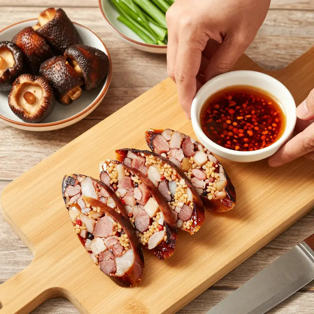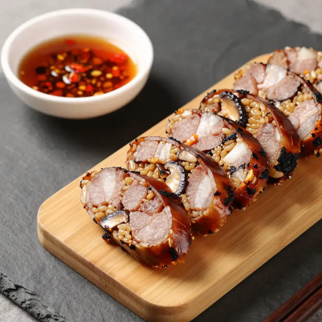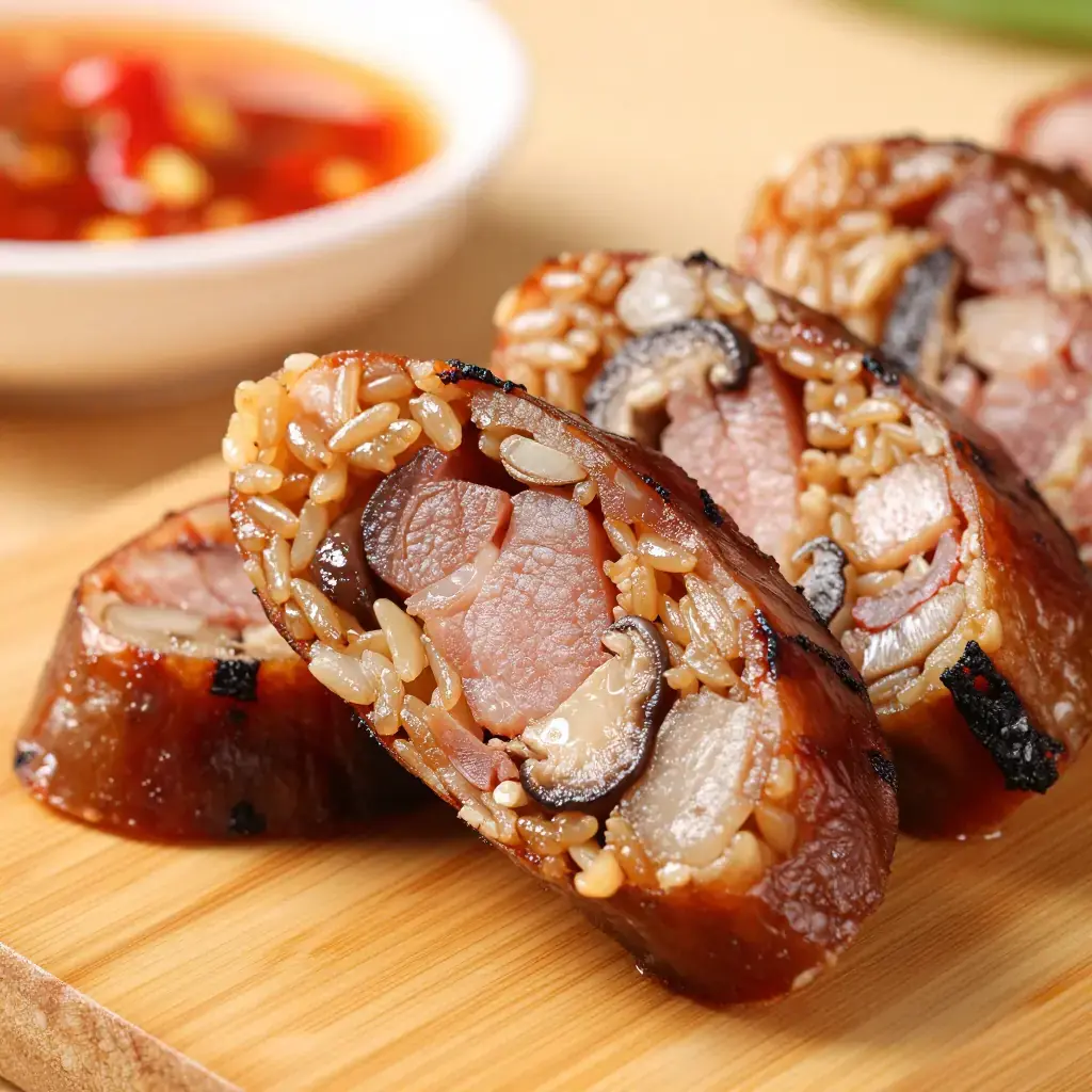 # Dongbei Nuo Mi Chang Nuo Mi Chang is the Dongbei answer to the universal love of stuffed sausage — natural pork casings packed with fragrant glutinous rice, diced pork fat, dried mushrooms, and warm spices, then steamed until tender and finished on a smoking grill or in a hot pan until the skin crisps and blisters. It is a fixture of Northeast Chinese winter markets and family new year feasts, and every household has its own ratio of fat to spice. Serves: 6 ## Ingredients - 1 kg (2.2 lbs) natural pork sausage casings, cleaned and soaked - 500g (1 lb 2 oz) glutinous (sweet) rice, soaked 4 hours and drained - 150g (5 oz) pork back fat, cut into 5 mm dice - 6 dried shiitake mushrooms, reconstituted and finely diced - 2 tbsp (30 ml) light soy sauce - 1 tbsp (15 ml) dark soy sauce - 1 tbsp (15 ml) Shaoxing wine - 1 tsp (5 ml) five-spice powder - 1 tsp (5 ml) white pepper - 1 tsp (5 ml) salt - 3 spring onions, finely chopped - 3 cloves garlic, minced - 1 tbsp (15 ml) sesame oil ## Instructions 1. Combine drained glutinous rice with pork fat, shiitake, soy sauces, Shaoxing wine, five-spice, white pepper, salt, spring onion, garlic, and sesame oil. Mix thoroughly. The filling should be just barely moist — the rice will absorb liquid as it steams. 2. Tie off one end of each casing. Using a sausage funnel or piping bag, fill each casing loosely with the rice mixture — only two-thirds full, as the rice expands significantly during steaming. Tie off the other end. Prick the sausages all over with a pin to prevent bursting. 3. Steam over rapidly boiling water for 40–45 minutes until the rice is fully cooked and the casing is firm. Rest 10 minutes before proceeding. 4. To finish, heat a dry skillet or griddle over medium-high heat. Cook sausages, turning every 2 minutes, for 8–10 minutes until the skin is golden, charred in spots, and crisp. Alternatively, grill over charcoal for a smoky finish (5–6 minutes per side). 5. Slice on the bias into 1.5 cm rounds and serve with a dipping sauce of chilli vinegar or light soy sauce with ginger. **Cook's Notes:** Steaming ahead and refrigerating makes the sausages firmer and easier to slice. The grilling step is non-negotiable — it transforms the sausage from soft and starchy to something entirely different in texture. Smoked sausages can be made by hot-smoking at 80 °C (175 °F) for 30 minutes after steaming.Images