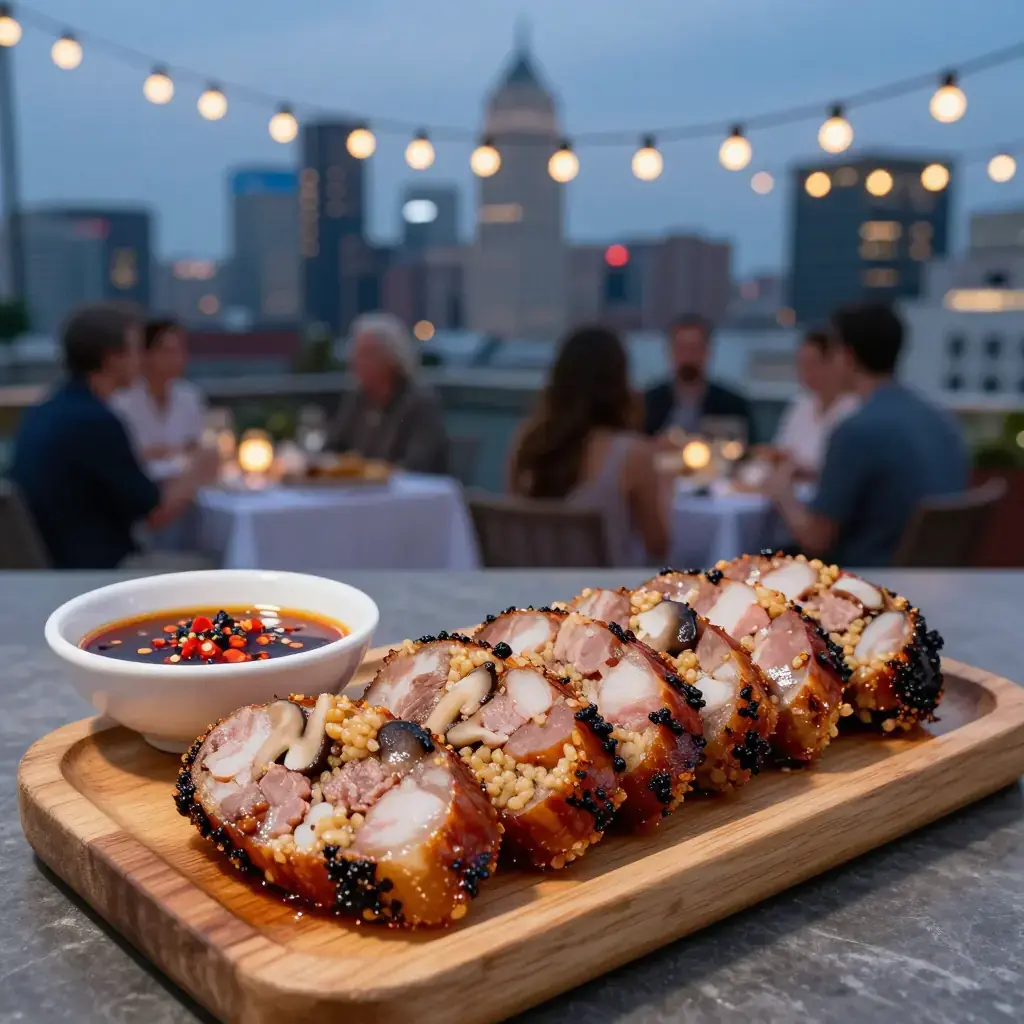 Nuo Mi Chang is the Dongbei answer to the universal love of stuffed sausage — natural pork casings packed with fragrant glutinous rice, diced pork fat, dried mushrooms, and warm spices, then steamed until tender and finished on a smoking grill or in a hot pan until the skin crisps and blisters. It is a fixture of Northeast Chinese winter markets and family new year feasts, and every household has its own ratio of fat to spice.