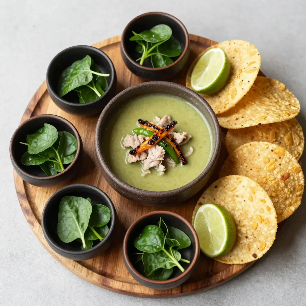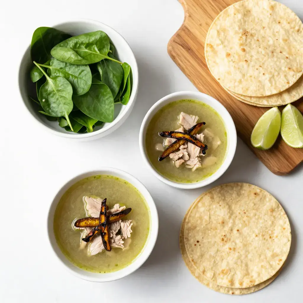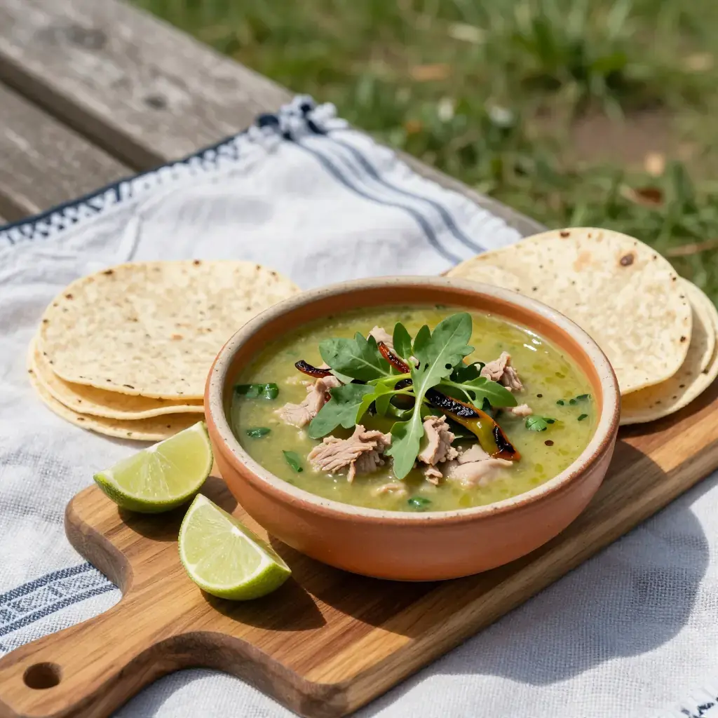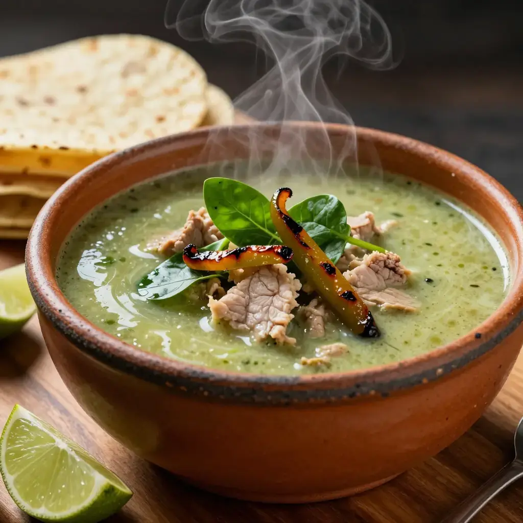 # Sopa de Verdolagas con Cerdo Verdolagas (purslane) is a succulent plant that grows wild across Mexico and is sold in bundles at every market from Oaxaca to the north. Though dismissed as a garden weed in much of the world, Mexicans prize it for its earthy, slightly lemony flavour and extraordinary nutritional density — it is one of the richest plant sources of omega-3 fatty acids. Serves: 4 ## Ingredients - 400g (14 oz) pork shoulder or riblets, cut into bite-sized chunks - 500g (1 lb) fresh verdolagas (purslane), thick stems removed - 400g (14 oz) tomatillos, husked and halved - 2 poblano chiles, roasted, peeled, and sliced - 1 small white onion, quartered - 3 cloves garlic - 1 tsp dried oregano - ½ tsp cumin seeds, toasted and ground - 1 litre (4 cups) water or low-sodium chicken broth - 1 tbsp olive oil or lard - Black pepper to taste ## Instructions 1. In a medium pot, combine the pork with the water, half the onion, and 2 garlic cloves. Bring to a boil, skim the foam, then reduce to a simmer. Cook for 30–35 minutes until the pork is just tender. Remove the pork with a slotted spoon; reserve the broth. 2. Char the tomatillos under a hot grill (broiler) or in a dry skillet for 5–6 minutes until softened and lightly blackened. Blend with the remaining onion, garlic, oregano, and cumin until smooth. 3. Heat the oil in the same pot over medium-high heat. Add the blended tomatillo sauce and fry, stirring constantly, for 5 minutes until it darkens and thickens slightly (this removes rawness). 4. Add the reserved pork broth and the cooked pork back to the pot. Simmer for 10 minutes. 5. Add the verdolagas and sliced poblano strips. Cook for just 5–7 minutes — the purslane should remain bright green and tender, not overcooked. 6. Taste and adjust pepper; add salt very sparingly if needed. **Cook's Notes:** Purslane cooks very quickly and turns unpleasantly slimy if overcooked — add it at the very end. Spinach or watercress can substitute but the flavour is quite different. Serve with warm corn tortillas and sliced radishes.Images