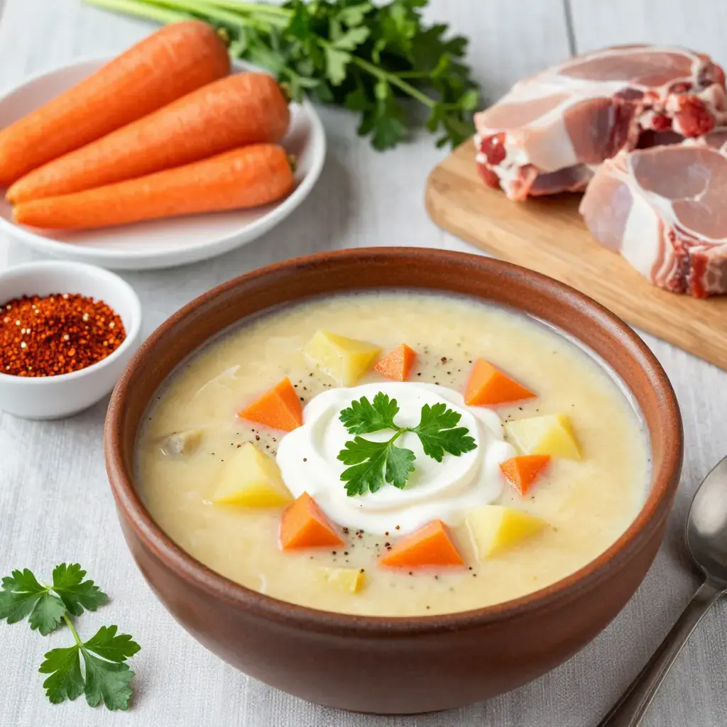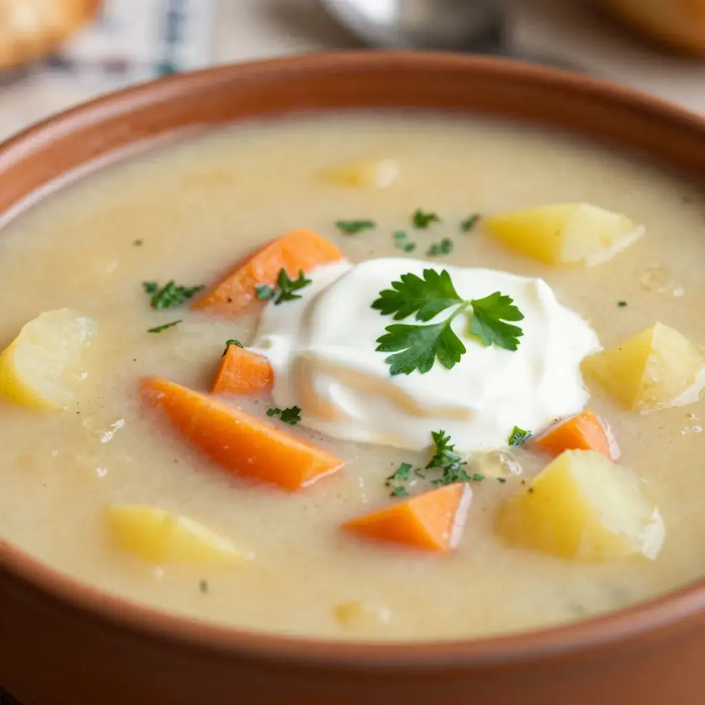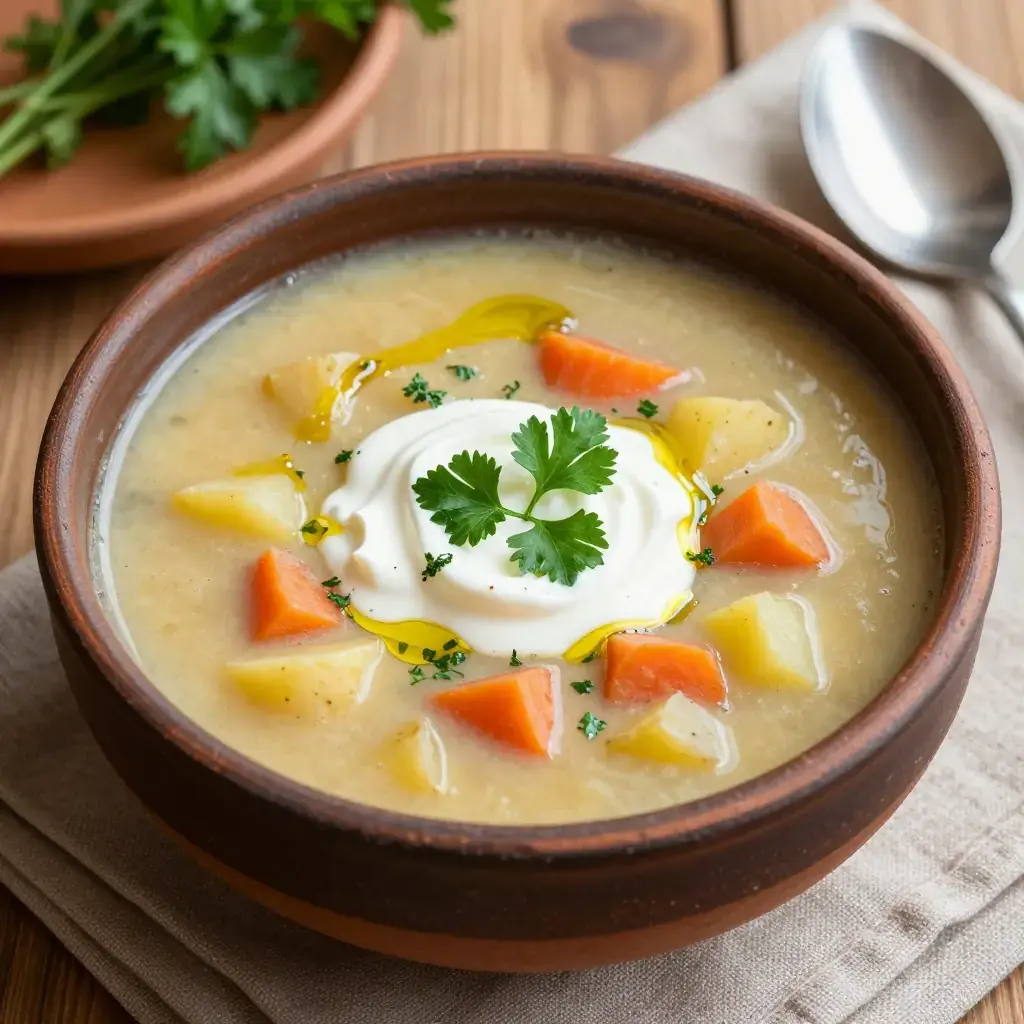 # Kisela Čorba od Povrća Čorba is the everyday soup of the Serbian table, derived from the Turkish word for broth. The sour variant — thickened with a mixture of egg and cream and sharpened with vinegar — is beloved for its restorative quality, particularly in winter. This vegetable version uses the root-heavy garden produce that cellars Serbian households through the cold months. Serves: 6 ## Ingredients - 3 medium carrots (about 300g / 10 oz), peeled and diced - 2 medium parsnips (about 250g / 9 oz), peeled and diced - 2 medium potatoes (about 350g / 12 oz), peeled and diced - 2 stalks celery, sliced - 1 medium leek, white part only, sliced - 1 medium onion, diced - 2 tbsp sunflower oil - 1.5 litres (6 cups) low-sodium vegetable broth - 2 tbsp white wine vinegar (or to taste) - 2 medium eggs - 100ml (⅓ cup) sour cream - 1 tbsp plain flour - 1 tsp sweet paprika - 1 tbsp fresh flat-leaf parsley, chopped - Black pepper to taste ## Instructions 1. Heat the oil in a large pot over medium heat. Sauté the onion and leek for 5–6 minutes until soft. Add the paprika and stir for 30 seconds. 2. Add the carrots, parsnips, potatoes, and celery. Stir to coat in the paprika oil. 3. Pour in the broth, bring to a boil, then reduce to a simmer. Cook for 20–25 minutes until all vegetables are completely tender. 4. In a small bowl, whisk together the eggs, sour cream, and flour until smooth. 5. Ladle about 200ml (¾ cup) of the hot soup into the egg mixture while whisking constantly (tempering). Then slowly pour the tempered mixture back into the pot, stirring. 6. Add the vinegar, starting with 1.5 tbsp and adjusting to taste — the soup should be pleasantly sour. Simmer very gently for 3–4 minutes (do not boil or the eggs will curdle). Season with black pepper. 7. Serve in deep bowls, garnished with fresh parsley. **Cook's Notes:** The tempering step is crucial — never add cold egg mixture directly to boiling soup. The sourness is the defining characteristic of this čorba; adjust vinegar to taste at the end. The soup is naturally low in sodium when made with unsalted low-sodium broth — hold off on any salt until you taste the finished dish.Images