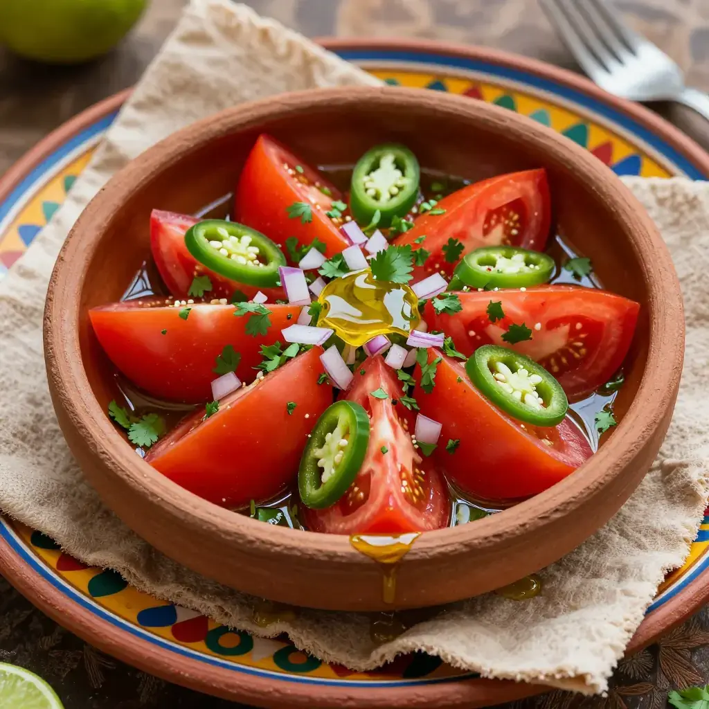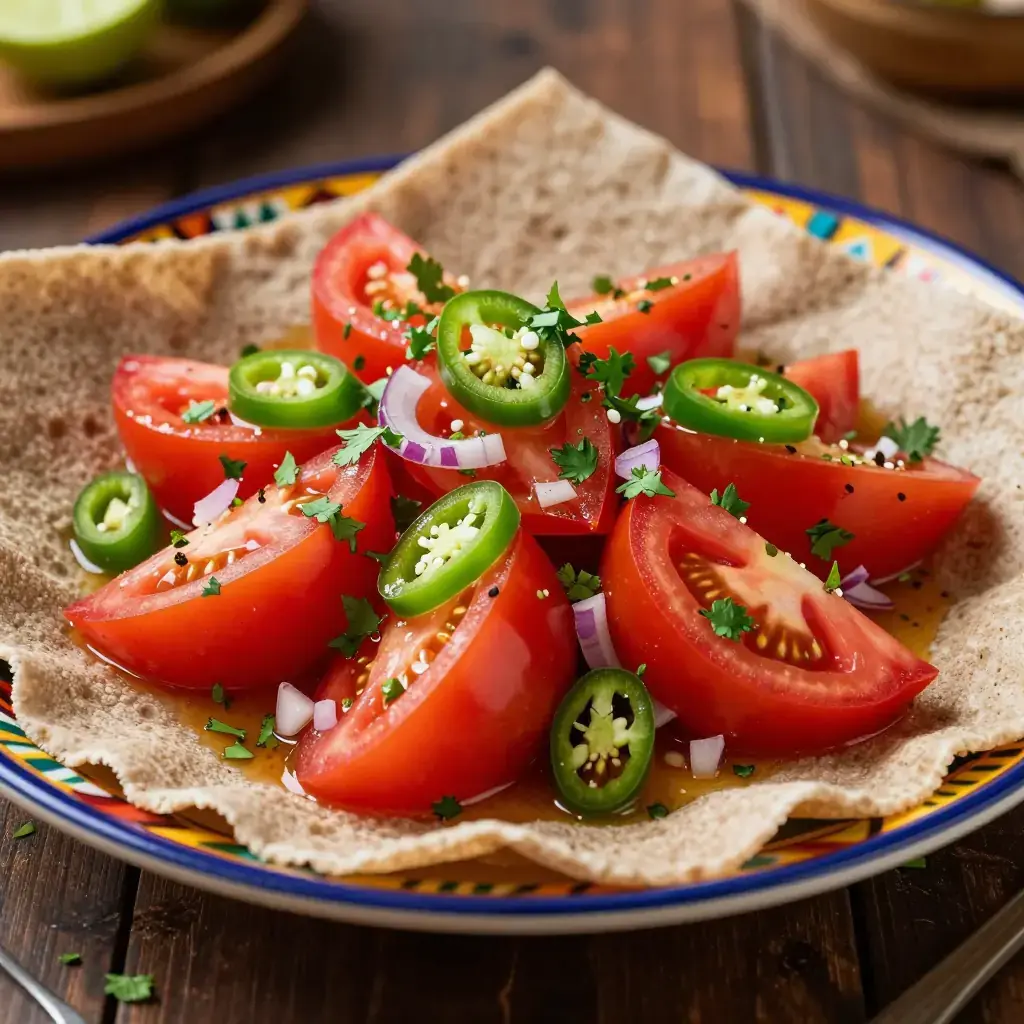 # Ye'abesha Timatim Salat At every Ethiopian meal, whether a weekday fasting lunch or a celebration spread, a simple tomato and herb salad appears alongside the injera. Ye'abesha timatim salat — the Habesha tomato salad — is dressed with fresh jalapeño, coriander, and just enough oil and lime to bring everything together. Its brightness and freshness cut through the deep, spiced stews that surround it. Serves: 4 ## Ingredients - 500g (1 lb) ripe tomatoes (a mix of sizes), cut into wedges or roughly chopped - 1 small red onion, very finely diced — approx. 80g (3 oz) - 2 fresh green jalapeño or serrano chillies, finely sliced into rounds - 1 small bunch fresh coriander (cilantro), roughly chopped — approx. 20g (0.7 oz) - 2 tbsp (8g) fresh flat-leaf parsley, roughly chopped - 3 tbsp (45ml) fresh lime juice - 2 tbsp (30ml) light vegetable or olive oil - 1/2 tsp (3g) salt - 1/4 tsp (1g) black pepper - 1/4 tsp (1g) ground cumin (optional but traditional) ## Instructions 1. Soak the diced red onion in cold water for 5 minutes to reduce sharpness. Drain and pat dry. 2. Combine tomatoes, onion, jalapeño rounds, coriander, and parsley in a bowl. 3. Whisk together lime juice, oil, salt, black pepper, and cumin if using. 4. Pour dressing over the salad and toss gently. Taste and adjust salt and lime — it should be bright and boldly seasoned. 5. Let stand 5-10 minutes before serving so the tomatoes release a little juice into the dressing. 6. Serve alongside injera and wot dishes as part of a full Ethiopian spread. **Cook's Notes:** Use the ripest tomatoes available — flavourless winter tomatoes will produce a flat salad. The jalapeño can be reduced or seeded for less heat, or doubled for a more fiery result. This salad is best made 15-30 minutes before serving — longer and the herbs wilt and the tomatoes become watery.Images