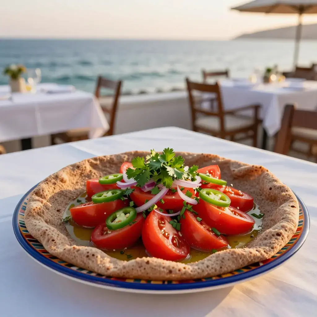 At every Ethiopian meal, whether a weekday fasting lunch or a celebration spread, a simple tomato and herb salad appears alongside the injera. Ye'abesha timatim salat — the Habesha tomato salad — is dressed with fresh jalapeño, coriander, and just enough oil and lime to bring everything together. Its brightness and freshness cut through the deep, spiced stews that surround it.