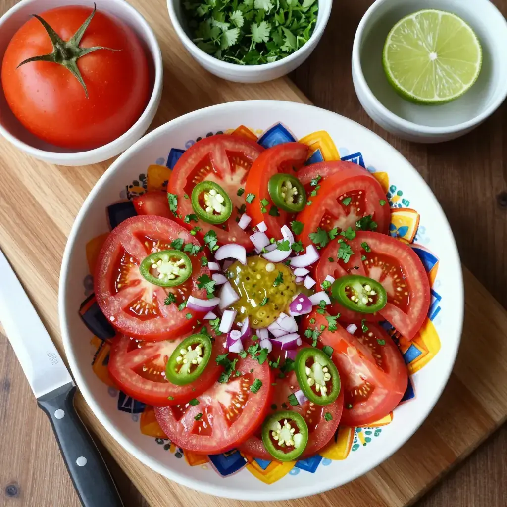 - Combine tomatoes, onion, jalapeño rounds, coriander, and parsley in a bowl.