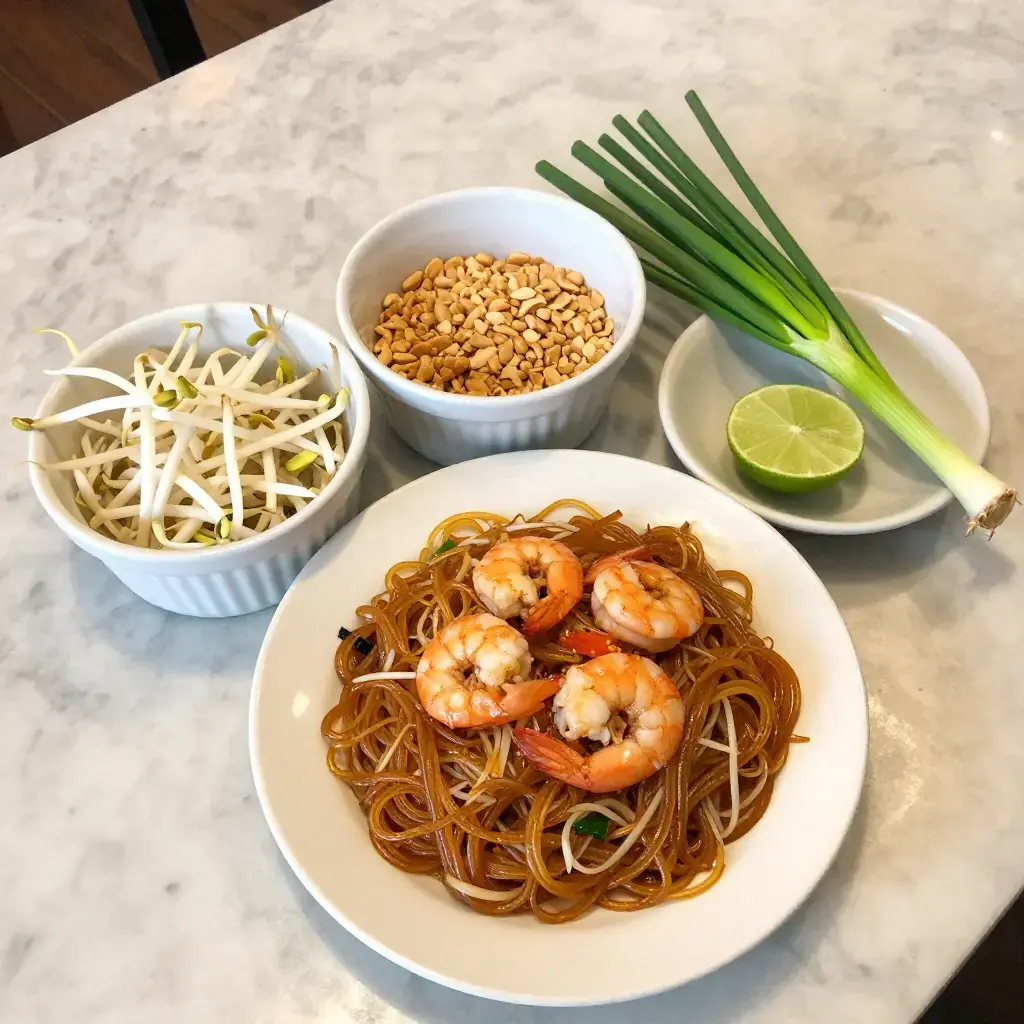 - Plate immediately. Top with bean sprouts, crushed peanuts, and lime wedges. Serve with the four Thai table condiments: chilli, fish sauce, sugar, vinegar.
