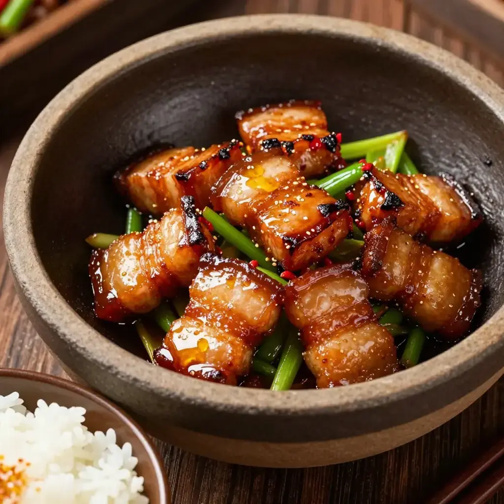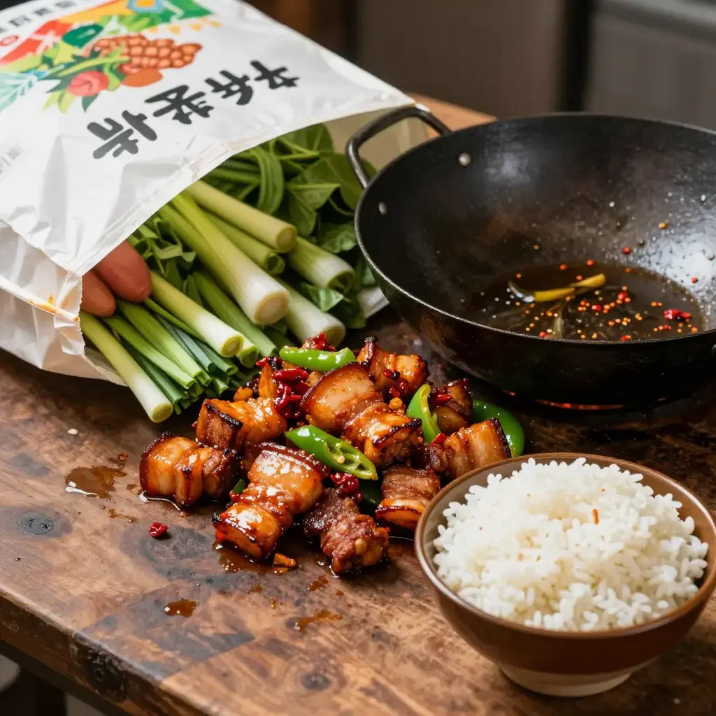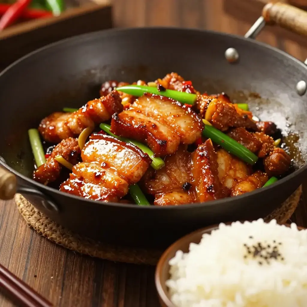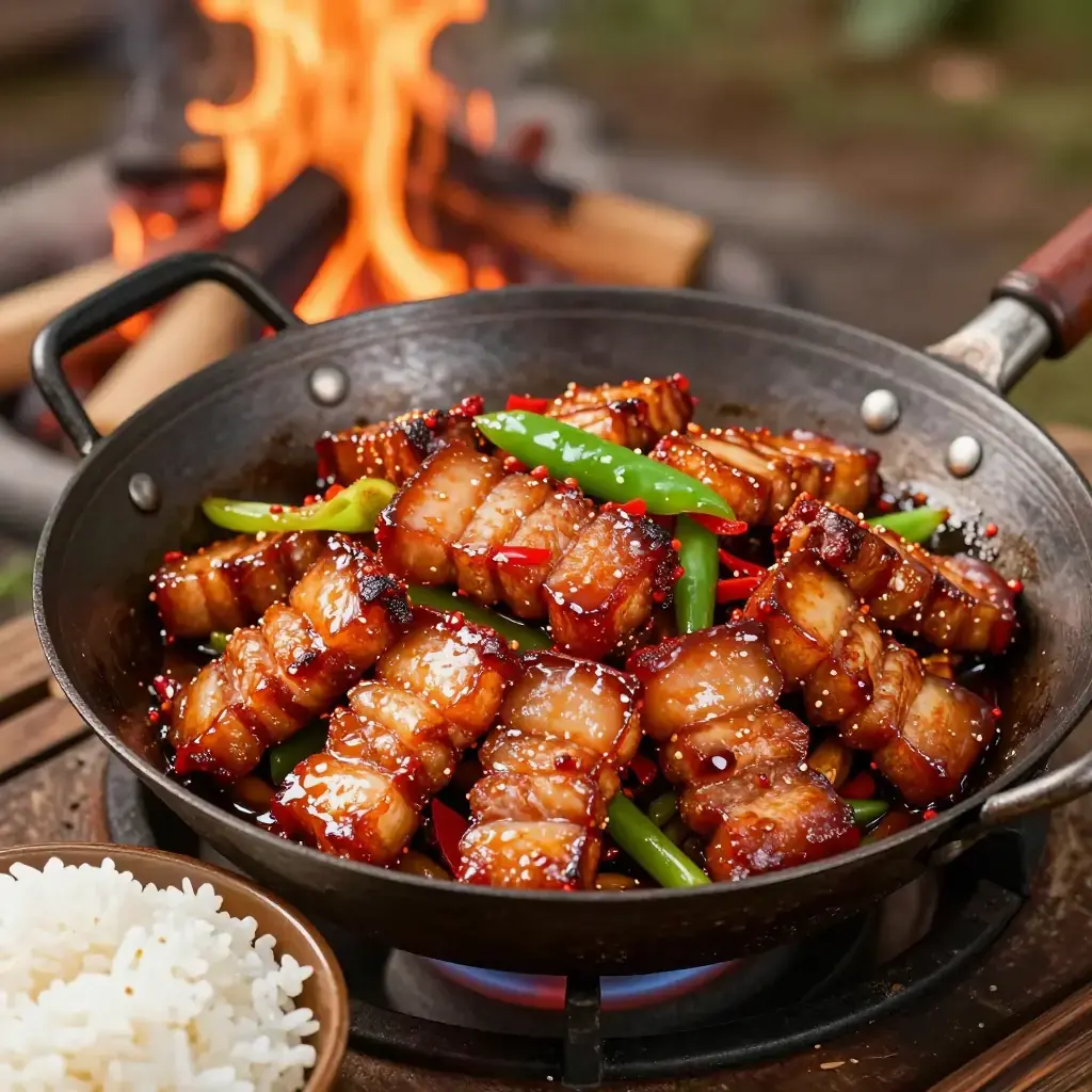 Hui Guo Rou — literally 'back-to-the-wok meat' — is one of Sichuan's most beloved home dishes. Pork belly is first poached whole with aromatics, then sliced thin and returned to a blazing wok where it curls and blisters against doubanjiang (fermented chilli bean paste) and the sweetness of green leeks. The result is a harmony of smoke, spice, and umami that defines Sichuanese home cooking.