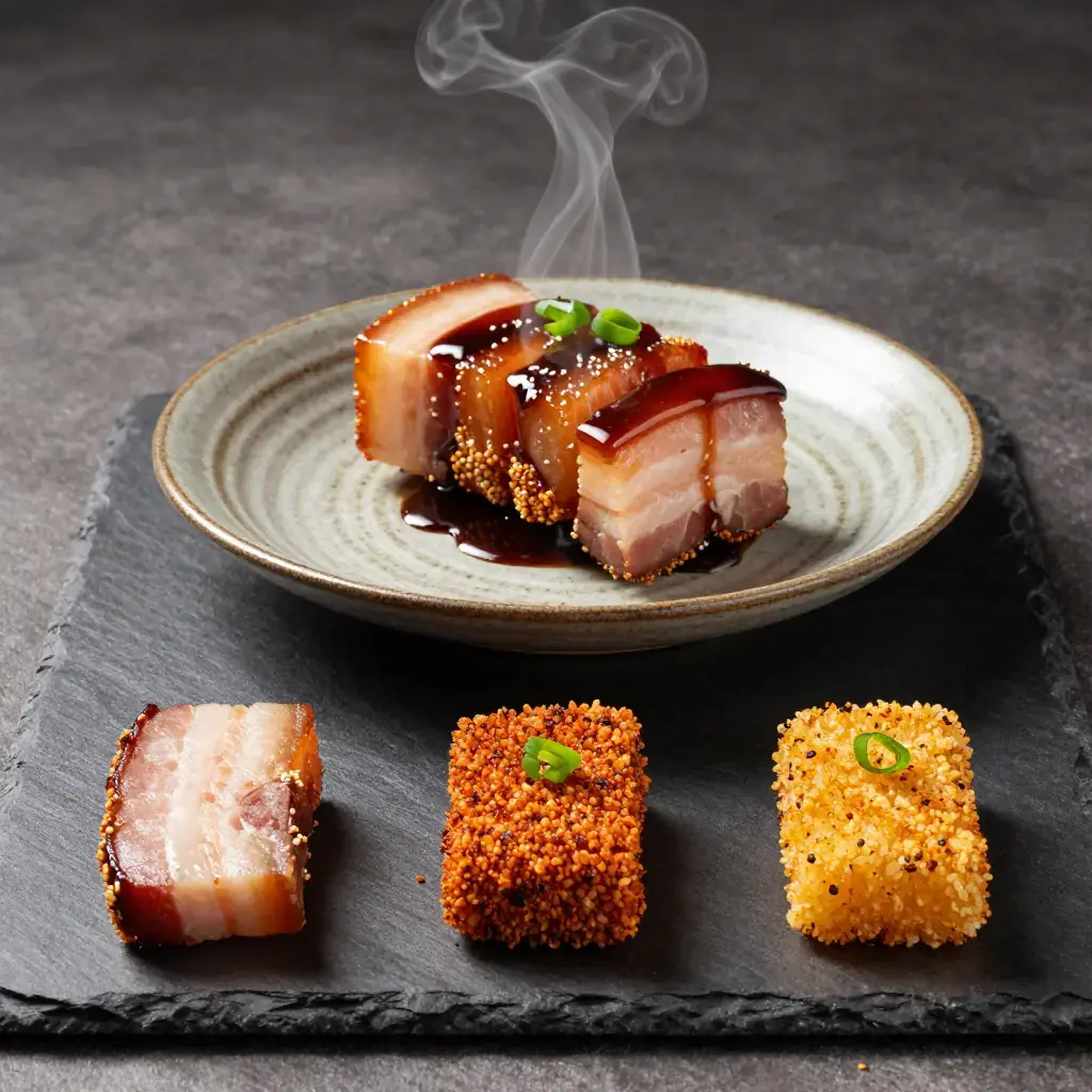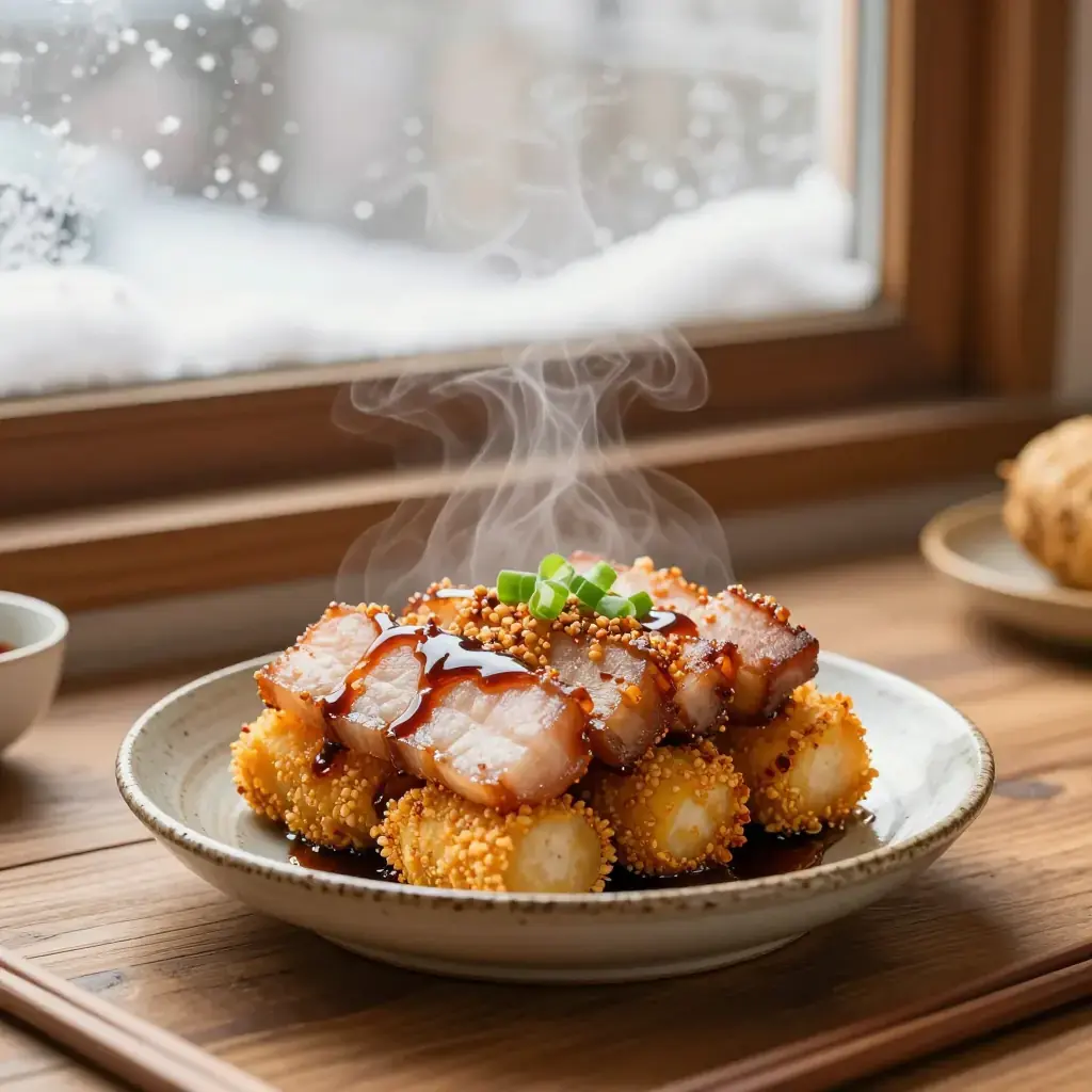 Mi Fen Rou is a jewel of Hunan home cooking and a staple of New Year banquets — thick slices of fatty pork belly coated in toasted spiced rice flour and steamed over a base of taro or sweet potato until the meat is meltingly tender. The rice flour absorbs the rendered fat and aromatics, forming a fragrant crust that is neither fried nor braised but something uniquely its own.