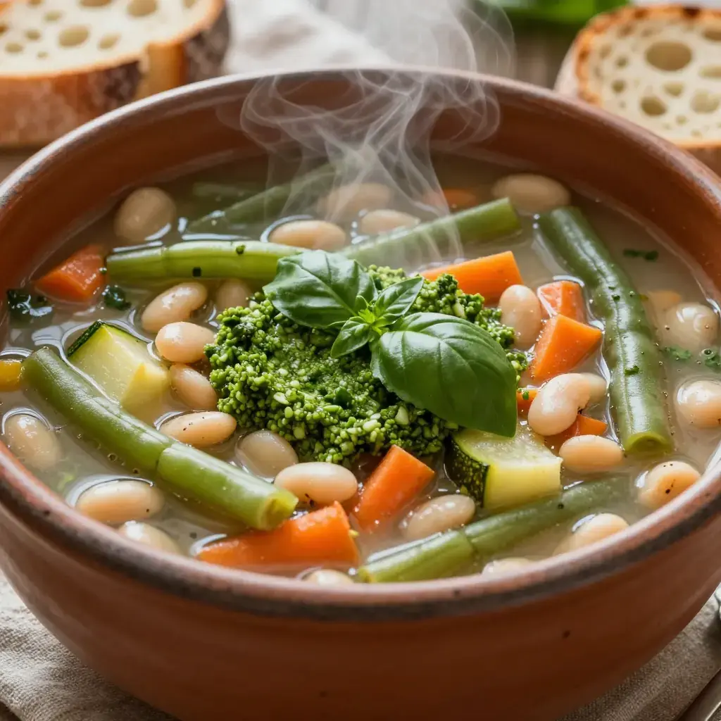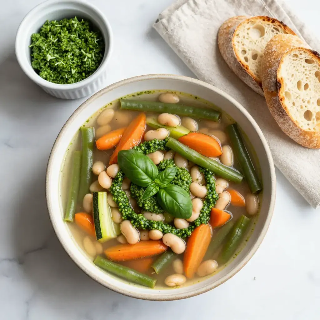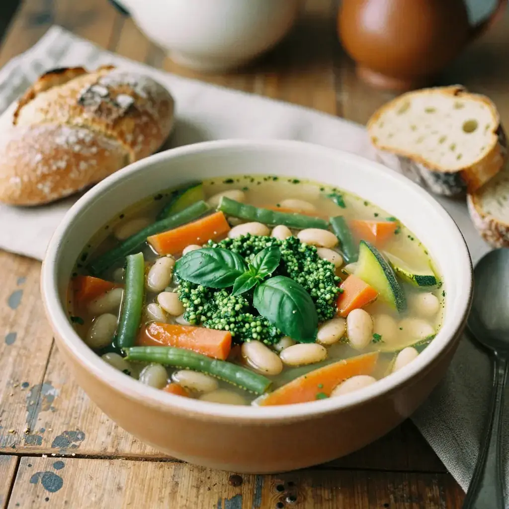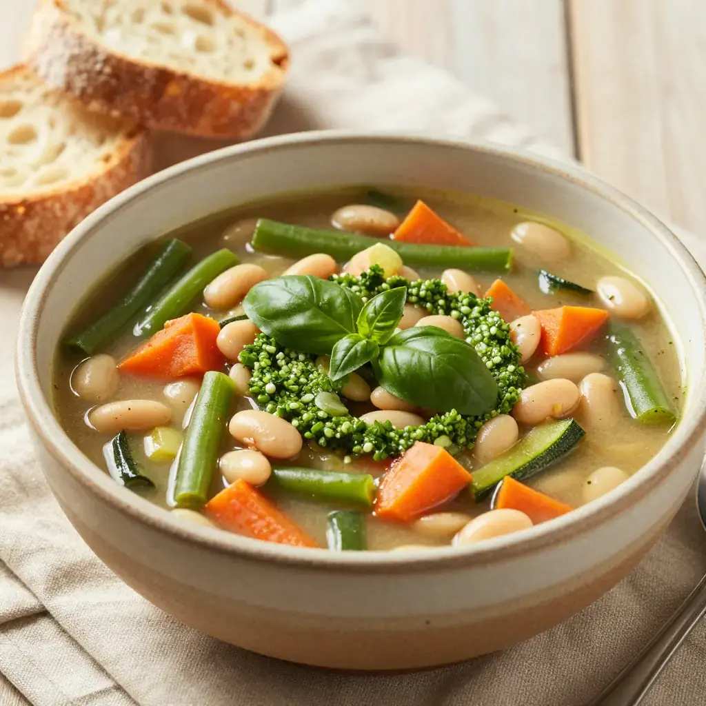 Soupe au Pistou is the great summer soup of Provence, a generous pot of seasonal vegetables and beans finished at the table with pistou — the Provençal cousin of pesto made from fresh basil, garlic, and olive oil without pine nuts. The soup itself is simple and nourishing; the raw herb paste stirred in at serving is what makes it extraordinary.
