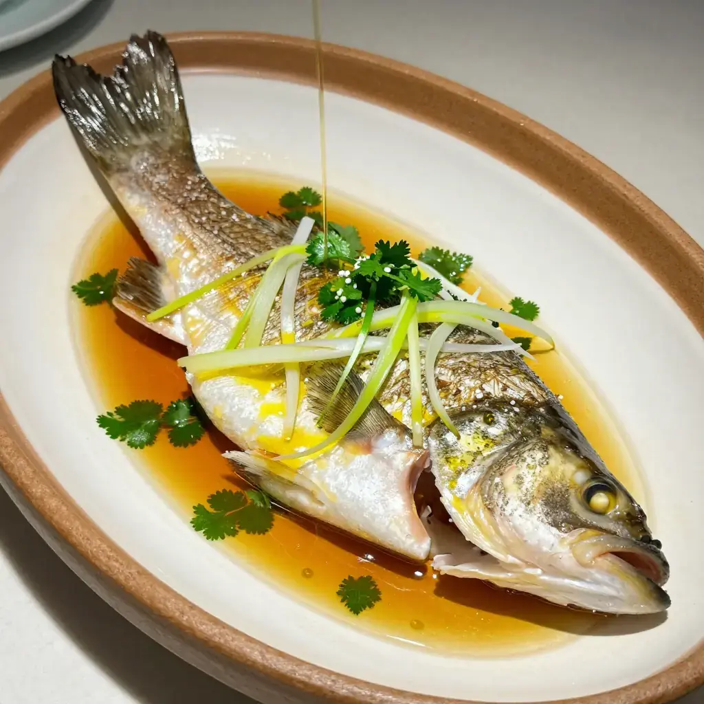 Qing Zheng Lu Yu — Cantonese steamed sea bass — is one of the definitive dishes of the southern Chinese table. A live or very fresh whole fish is steamed above boiling water for no more than ten minutes, then dressed with fine julienned ginger and spring onion before being doused with a sizzling pour of hot oil that blooms the aromatics and cooks them in a flash. The sauce is a simple mixture of soy and sugar. It is the Cantonese art of restraint at its finest.