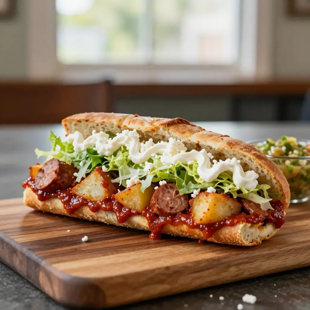 # Pambazos A beloved Mexico City street food, pambazos are white rolls soaked in a guajillo chile sauce, then fried on a griddle until the crust turns deeply crimson and faintly crisp. The filling of crumbled Mexican chorizo and mashed potato is simple but deeply satisfying — a classic late-night antojito sold from carts all over the capital. Serves: 4 ## Ingredients - 4 pambazo or telera rolls (about 100g / 3.5 oz each) - 250g (9 oz) Mexican-style fresh chorizo, casings removed - 400g (14 oz) waxy potatoes, peeled and diced 1 cm - 3 guajillo chiles, stemmed and seeded - 2 ancho chiles, stemmed and seeded - 3 garlic cloves - 1 tsp (5ml) cider vinegar - 2 tbsp (30ml) neutral oil, plus more for griddle - 1 tsp (5g) salt - 150g (5 oz) shredded iceberg lettuce - 120g (4 oz) crumbled queso fresco - 100ml (3.5 fl oz) Mexican crema or soured cream ## Instructions 1. Cover guajillo and ancho chiles with boiling water and soak 15 minutes until pliable. Drain, then blend with garlic, vinegar, 120ml (½ cup) fresh water, and salt to a smooth, pourable sauce. 2. Boil potatoes in salted water 12–14 minutes until just tender; drain well. 3. Cook chorizo in a dry skillet over medium-high heat, breaking up the meat, 6–8 minutes until fat has rendered and edges are crisp. Add potatoes and toss together 2 minutes. Season to taste. 4. Slice rolls open but do not separate. Remove a little of the inner crumb to make room for the filling. Fill each generously with the chorizo-potato mixture. 5. Heat a comal or cast-iron griddle over medium heat and brush lightly with oil. Dip each filled roll into the chile sauce on both cut sides and exterior, letting it soak in 5 seconds per side. 6. Place dipped rolls on the hot griddle and press gently with a spatula. Cook 3–4 minutes per side until the chile crust is set, fragrant, and darkens to a deep red — not black. 7. Slice open to order and top with shredded lettuce, queso fresco, and a drizzle of crema. Eat immediately. **Cook's Notes:** Traditional pambazo rolls are softer and less crusty than teleras; any plain white bun will work. The chile dip should be thick enough to coat but thin enough to soak in — add water a tablespoon at a time if needed. Serve with salsa verde for extra heat.Images