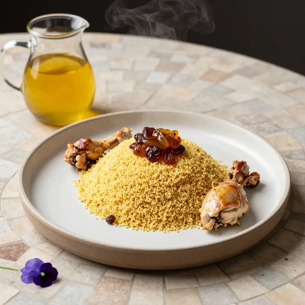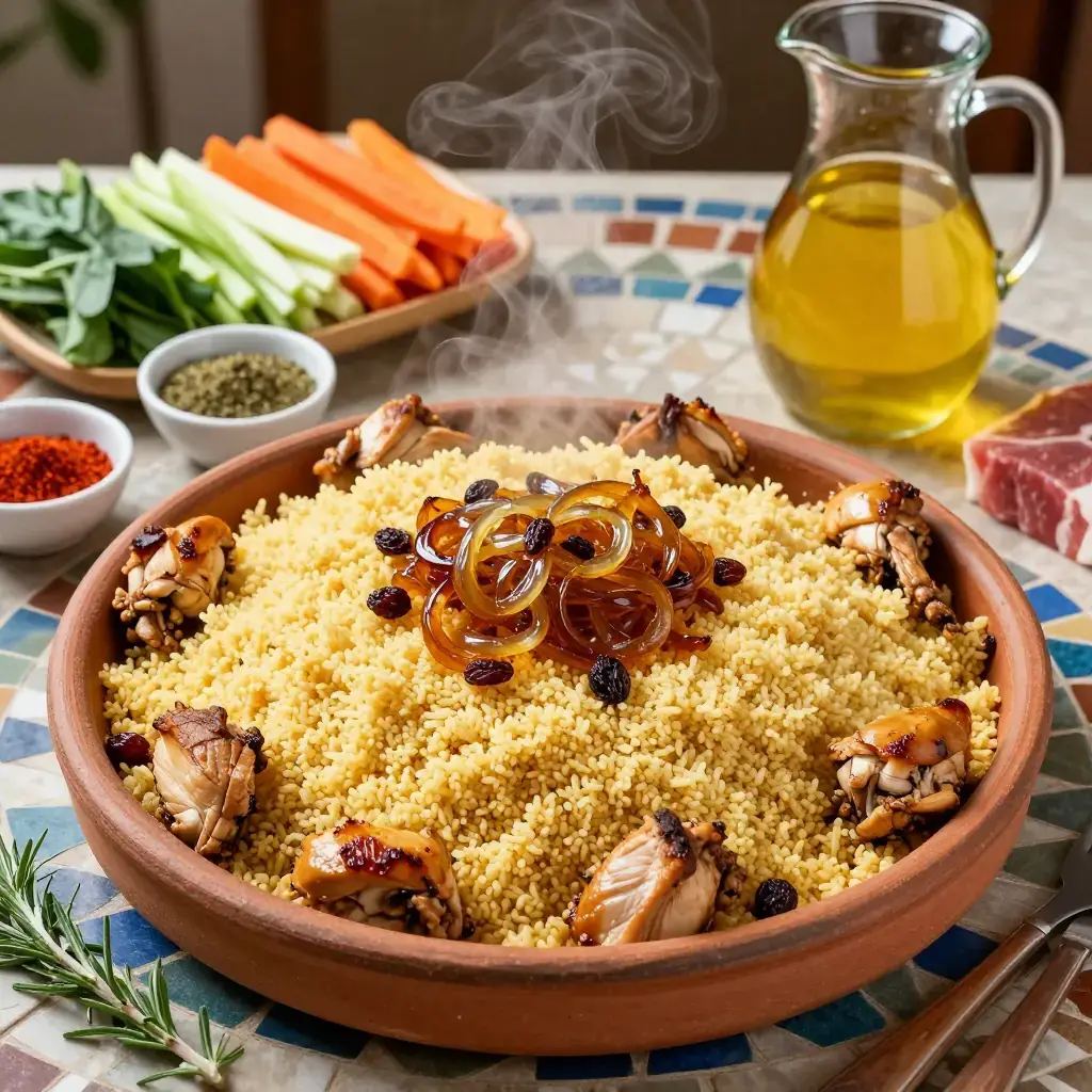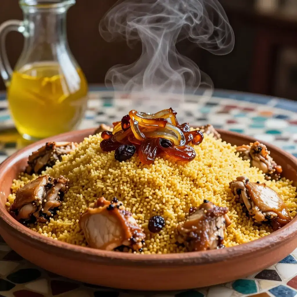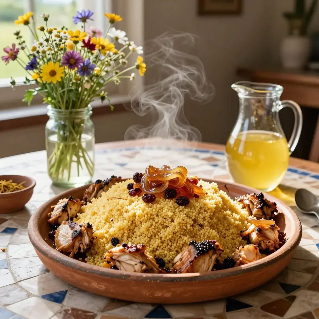 Couscous Tfaya is the Friday dish of Morocco's cities — a whole steamed couscous mounded on a platter and crowned with tfaya, a slow-cooked mass of caramelised onions, golden raisins, and warm spices, then finished with a whole braised chicken or lamb shank half-buried in the grain. It is a celebratory weekend-project dish requiring patience with the traditional three-pass steaming of the couscous.