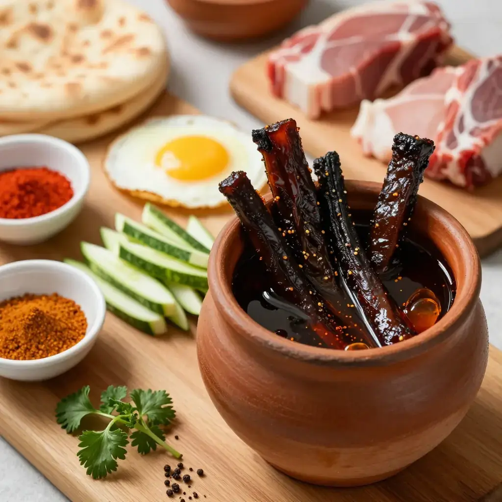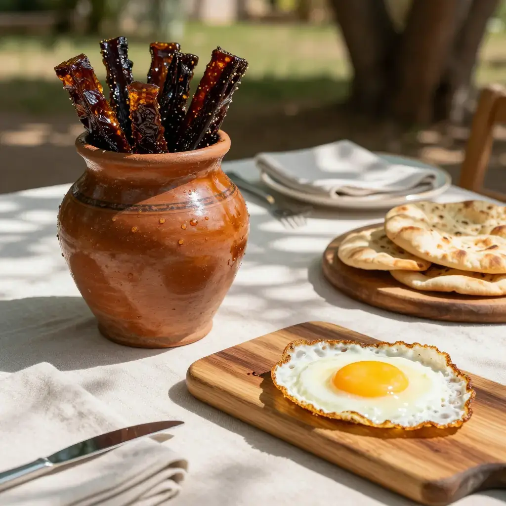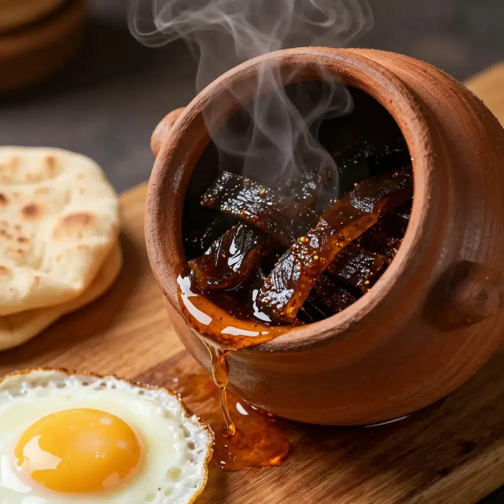 Cook's Notes: Khlii is shelf-stable for weeks when fully submerged in fat in a cool pantry and for up to a year refrigerated. The fermented, gamey depth is the point — do not substitute with uncured beef and expect the same result. The fat itself becomes a flavoured cooking medium prized for frying eggs.