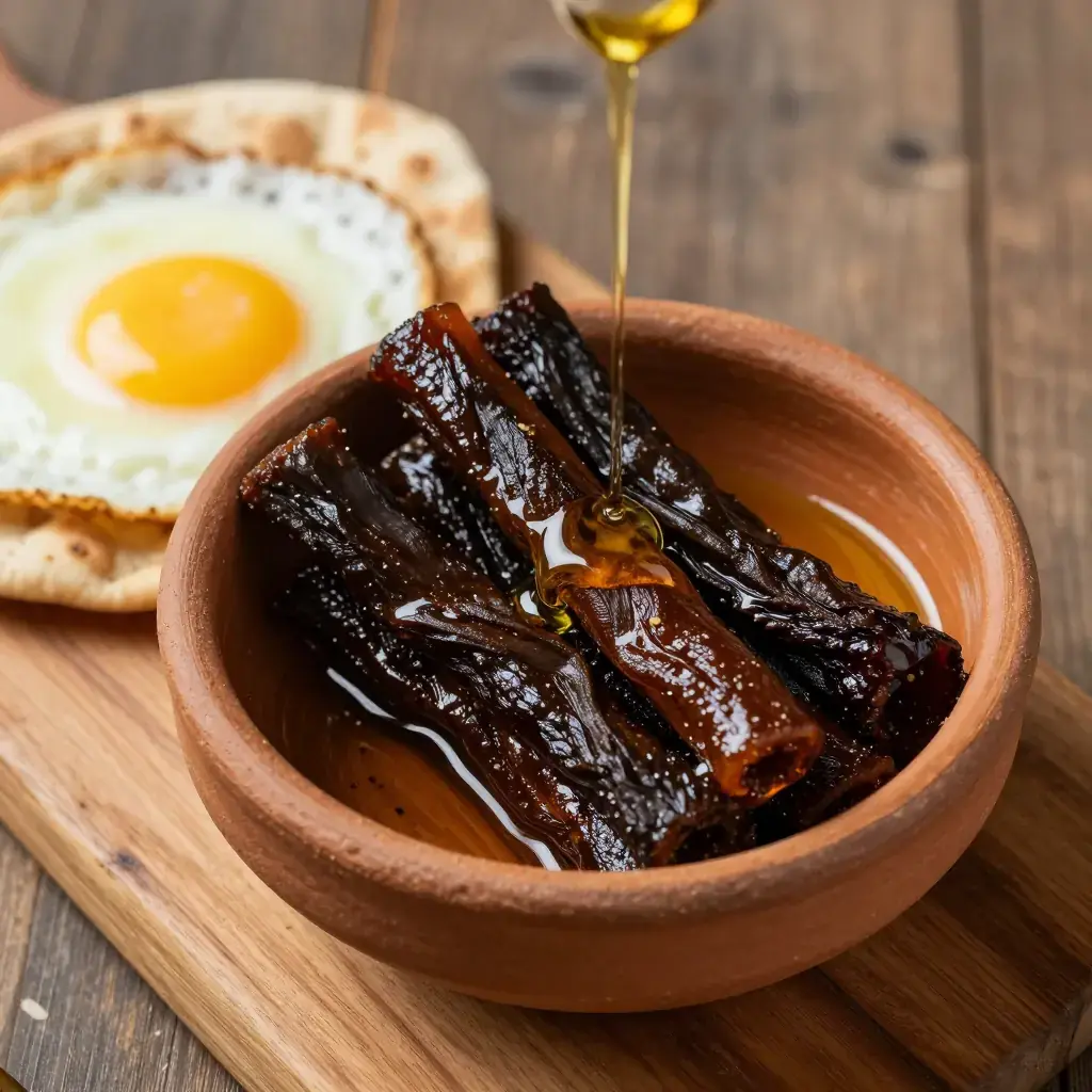 Khlii is one of the oldest preserved foods of the Moroccan pantry — strips of beef or camel meat marinated in a spice paste, dried in the sun, then slow-cooked and submerged in their own rendered fat and oil to preserve for up to two years. A staple of the Fes medina, it has been made by Moroccan families for centuries as a means of preserving the meat from the Eid al-Adha sacrifice. A small amount stirred into eggs or added to a tagine delivers intense, fermented depth.