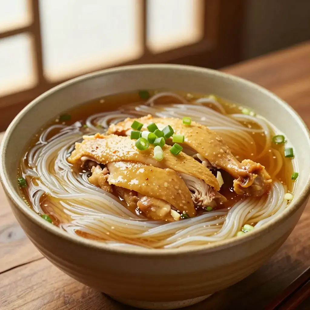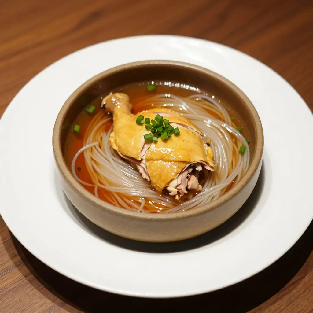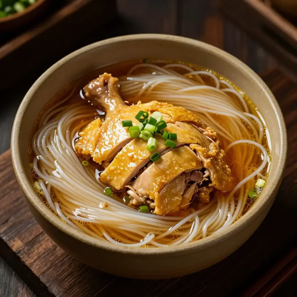 Yongchun county in Fujian is famous for its lao jiu — a deep amber rice wine aged in earthenware crocks and given as a gift at births and weddings. This noodle soup is the festive way to use it: chicken pieces are braised in the wine with ginger until the broth turns rich and slightly sweet, then ladled over thin rice vermicelli. It is traditionally served to mothers after childbirth to restore warmth and energy.