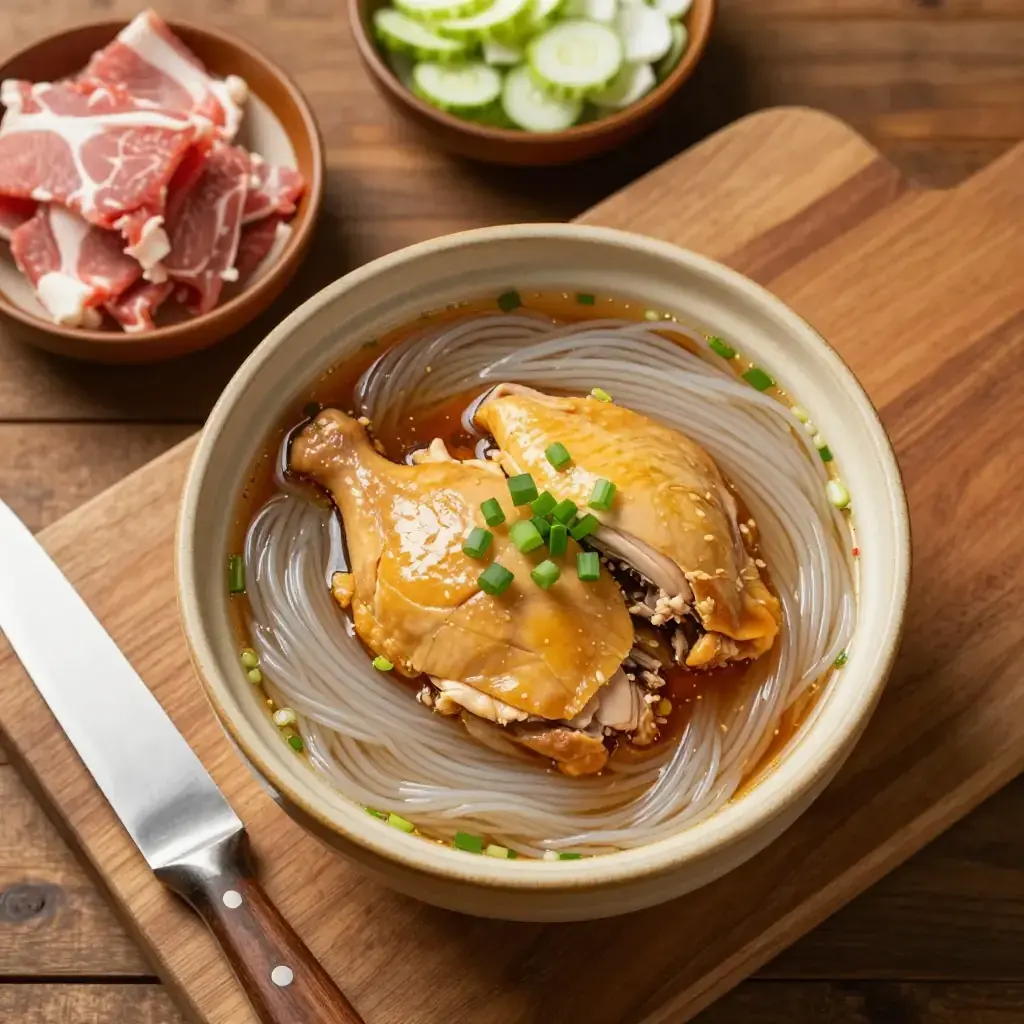 # Yong Chun Lao Jiu Ji Mian (永春老酒鸡面) Yongchun county in Fujian is famous for its lao jiu — a deep amber rice wine aged in earthenware crocks and given as a gift at births and weddings. This noodle soup is the festive way to use it: chicken pieces are braised in the wine with ginger until the broth turns rich and slightly sweet, then ladled over thin rice vermicelli. It is traditionally served to mothers after childbirth to restore warmth and energy. Serves: 4 ## Ingredients - 600g (1.3 lb) bone-in chicken thighs and drumsticks - 300ml (1.25 cups) Fujian aged rice wine (or Shaoxing wine as substitute) - 400ml (1.75 cups) water - 60g (2 oz) fresh ginger, cut into thick coins and lightly smashed - 3 tbsp (45ml) neutral oil (traditionally sesame oil) - 1 tsp salt - 0.5 tsp white pepper - 300g (10 oz) dried rice vermicelli (mi fen), soaked in cold water 20 minutes - 2 spring onions, sliced, to garnish - Fresh coriander to garnish ## Instructions 1. Pat the chicken pieces dry. Heat oil in a wok or heavy pot over high heat. Brown the chicken on all sides, about 4–5 minutes total. 2. Add the ginger and stir-fry 1 minute until fragrant. Pour in the rice wine and water. Bring to a boil, skimming any foam. 3. Reduce heat, cover and simmer for 30–35 minutes until the chicken is very tender and the broth has a deep golden-amber colour. 4. Season with salt and white pepper. Taste — the broth should be warmly sweet and aromatic from the wine. 5. Cook the soaked rice vermicelli in boiling water for 2 minutes, drain, and divide among bowls. 6. Place chicken pieces on top of the noodles and ladle the rice wine broth over generously. Garnish with spring onions and coriander. **Cook's Notes:** Fujian lao jiu is available at specialist Chinese grocers. Do not substitute with ordinary cooking wine — the aged sweetness is central to the flavour. A few dried longan fruits added with the ginger enrich the broth further.Images