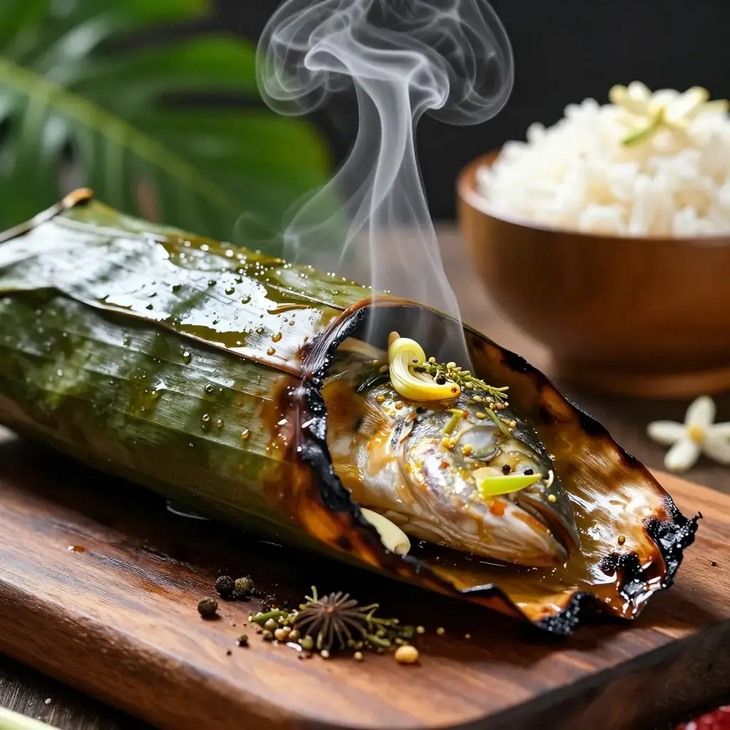 - Place parcels on a charcoal grill over medium-hot coals. Cook 12–15 minutes per side, turning once carefully, until the banana leaf is charred and fragrant.