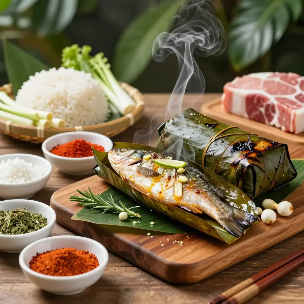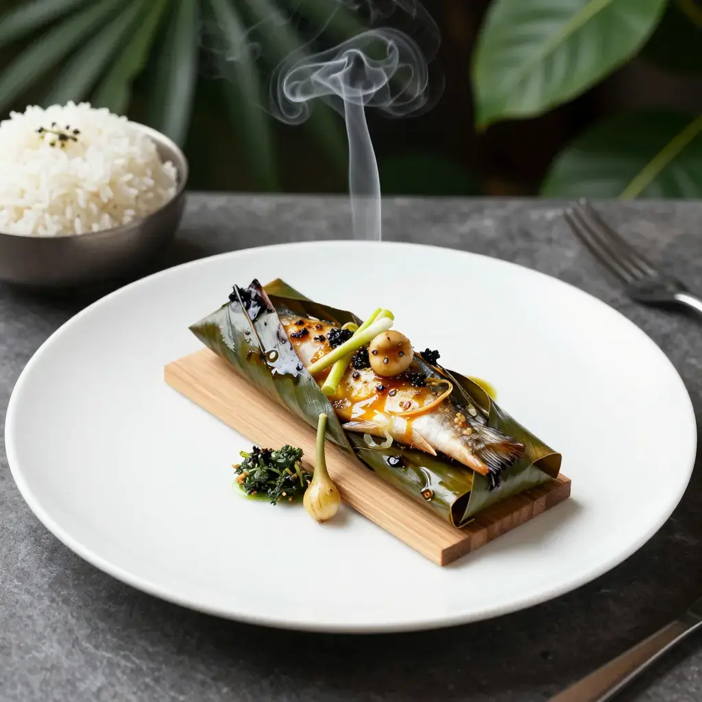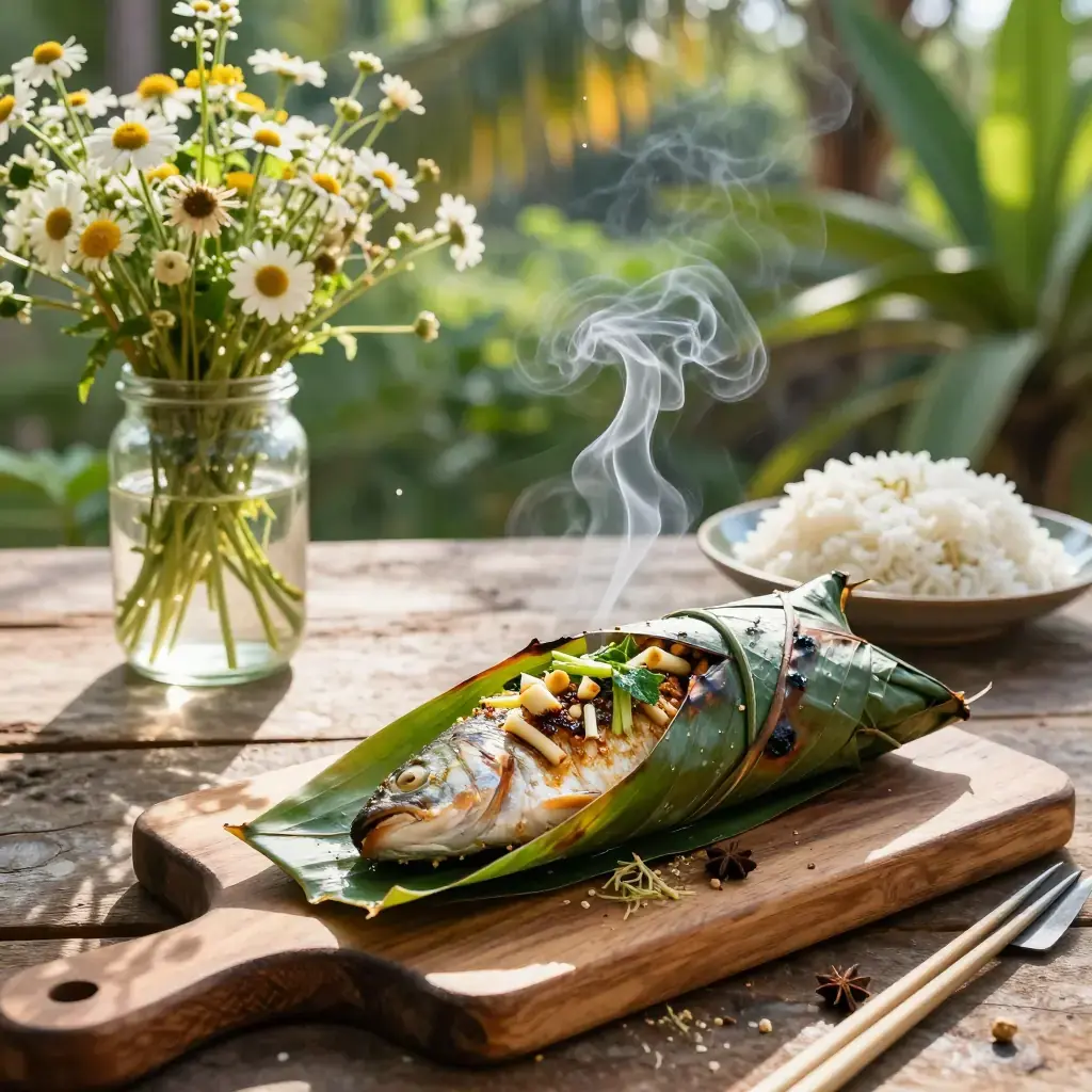 The Dai people of Xishuangbanna in southern Yunnan have a cooking technique called bao shao — wrapping food in banana leaves and placing the parcel directly into embers or on a charcoal grill. The leaves seal in steam and impart a subtle grassy fragrance. Fish prepared this way emerges extraordinarily moist, perfumed with lemongrass, galangal, and wild Sichuan pepper unique to the Dai repertoire.