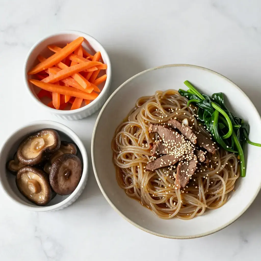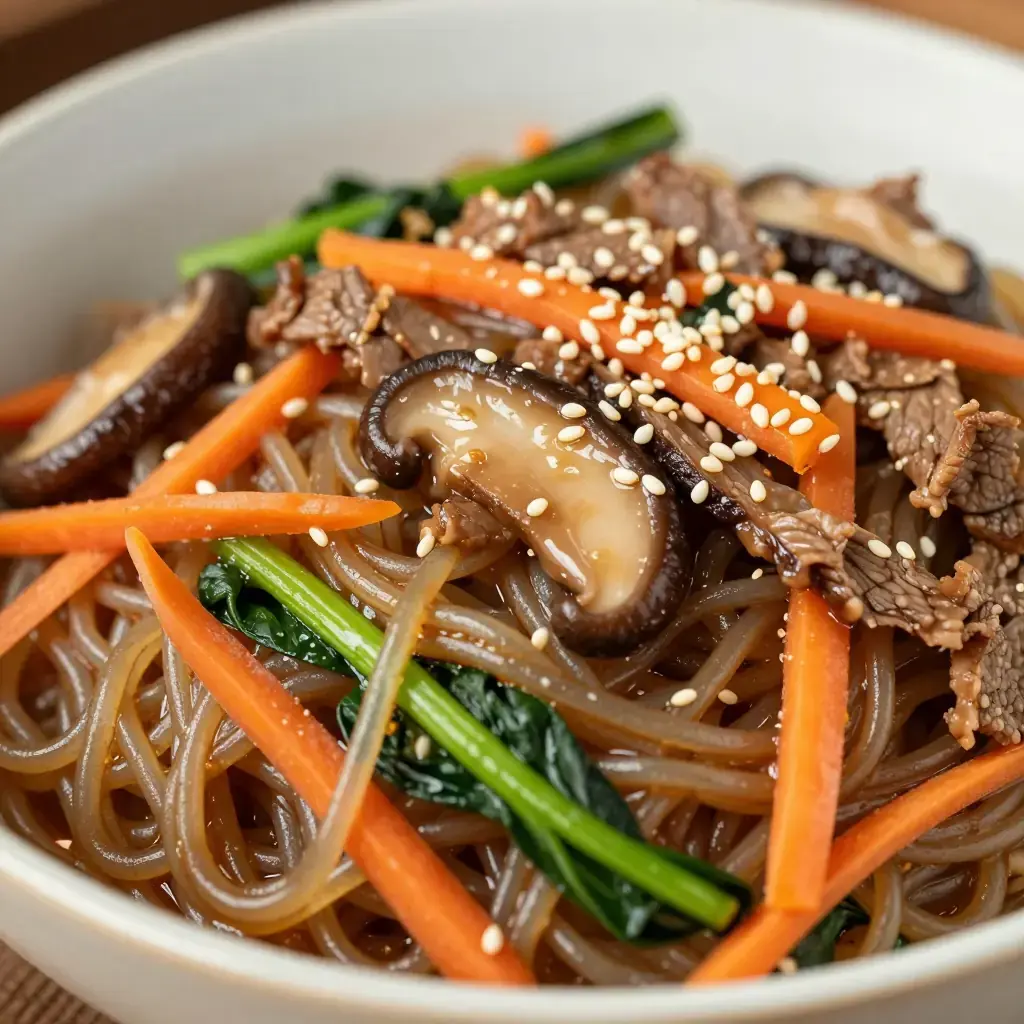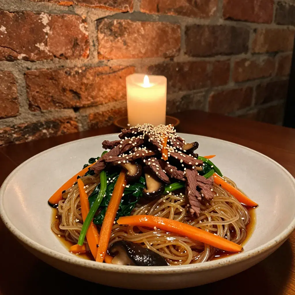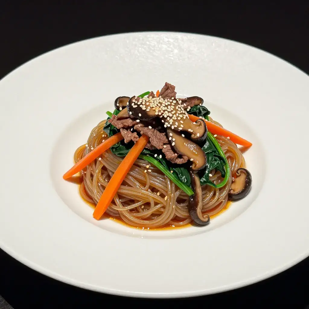 Japchae is Korea's beloved celebration noodle dish, a staple at birthdays, holidays, and family gatherings since the Joseon dynasty. The chewy, translucent glass noodles made from sweet potato starch are tossed with a rainbow of vegetables and beef in a subtly sweet soy glaze.