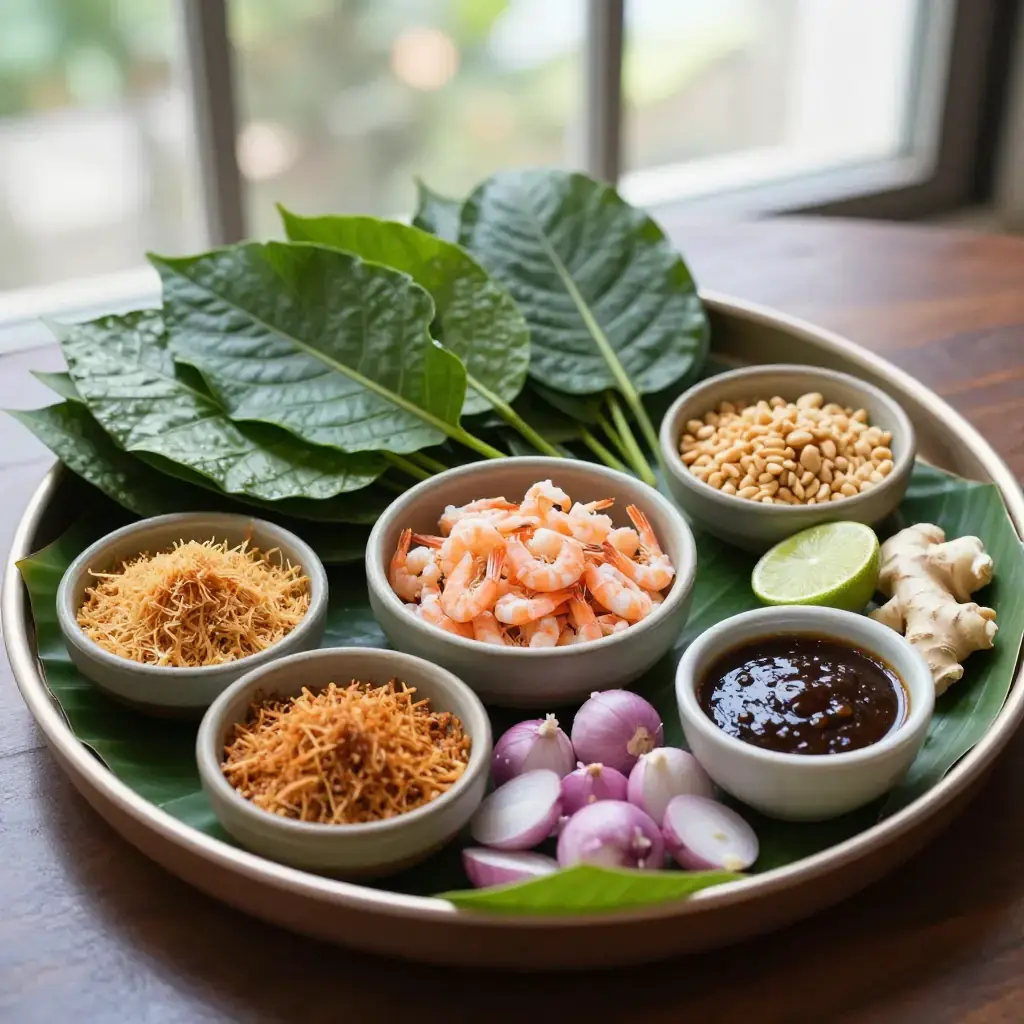 - To eat: lay a betel leaf in your palm, glossy side down. Add a small pinch each of coconut, dried shrimp, peanuts, lime, shallot, and ginger. Drizzle with a little sauce, fold the leaf into a parcel, and eat in one bite.