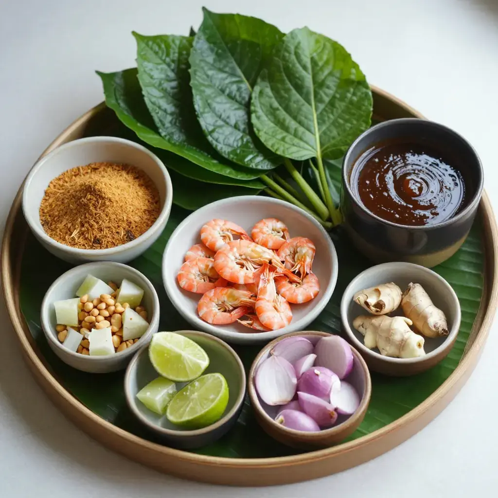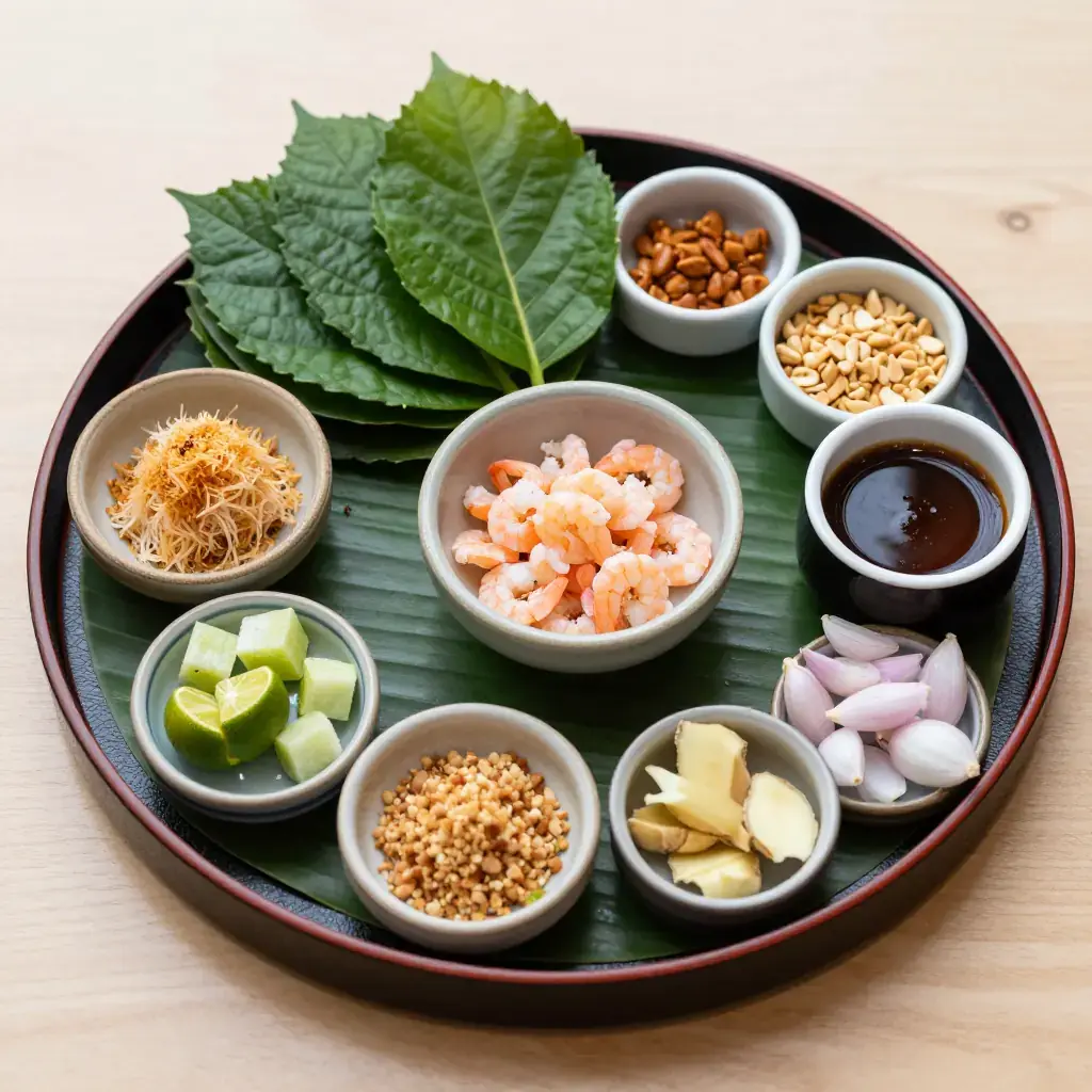 - 20–24 fresh betel leaves (ใบชะพลู), stems trimmed, or baby spinach as substitute