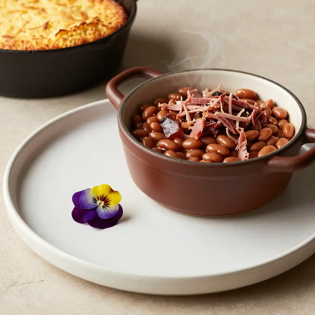 # Southern Baked Beans Long before canned beans arrived, Appalachian households soaked and slow-baked dried pinto or navy beans overnight in a wood stove with a smoked ham hock — a thrifty, protein-rich staple that fed families through hard winters. This heirloom technique produces beans with a silky interior and deeply savoury, smoky pot liquor that is nearly as prized as the beans themselves. Serves: 6 ## Ingredients - 500g (1 lb) dried navy beans or pinto beans, soaked overnight and drained - 1 smoked ham hock (about 700g / 1.5 lb) - 1 large onion, finely diced - 3 cloves garlic, minced - 2 tbsp (30ml) molasses - 1 tbsp (15ml) apple cider vinegar - 1 tsp dry mustard powder - 1 tsp black pepper - 1.2 litres (5 cups) water - Salt to taste (add only at the end) ## Instructions 1. Preheat oven to 150°C (300°F). 2. In a large Dutch oven or heavy bean pot, combine the soaked and drained beans, ham hock, onion, and garlic. 3. Stir in molasses, apple cider vinegar, mustard powder, and black pepper. Pour over the water — beans should be submerged by 2-3cm (1 inch). 4. Cover tightly with a lid and bake for 4-5 hours, checking every hour to add hot water as needed to keep beans just covered. 5. In the final 30 minutes, remove the lid to allow the liquid to reduce and the top beans to colour slightly. 6. Remove the ham hock. Pull meat from the bone, chop, and stir back into the beans. 7. Season with salt only now — adding salt early toughens the skins. Serve with skillet cornbread or rice. **Cook's Notes:** The low, slow bake is non-negotiable for authentic texture. If you prefer a thicker pot liquor, mash a spoonful of beans against the side of the pot and stir back in. Leftovers reheat beautifully with a splash of water.Images