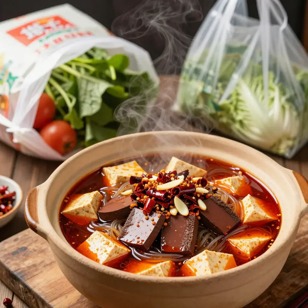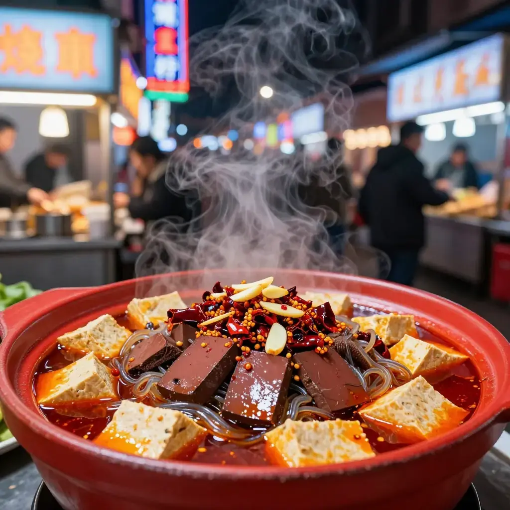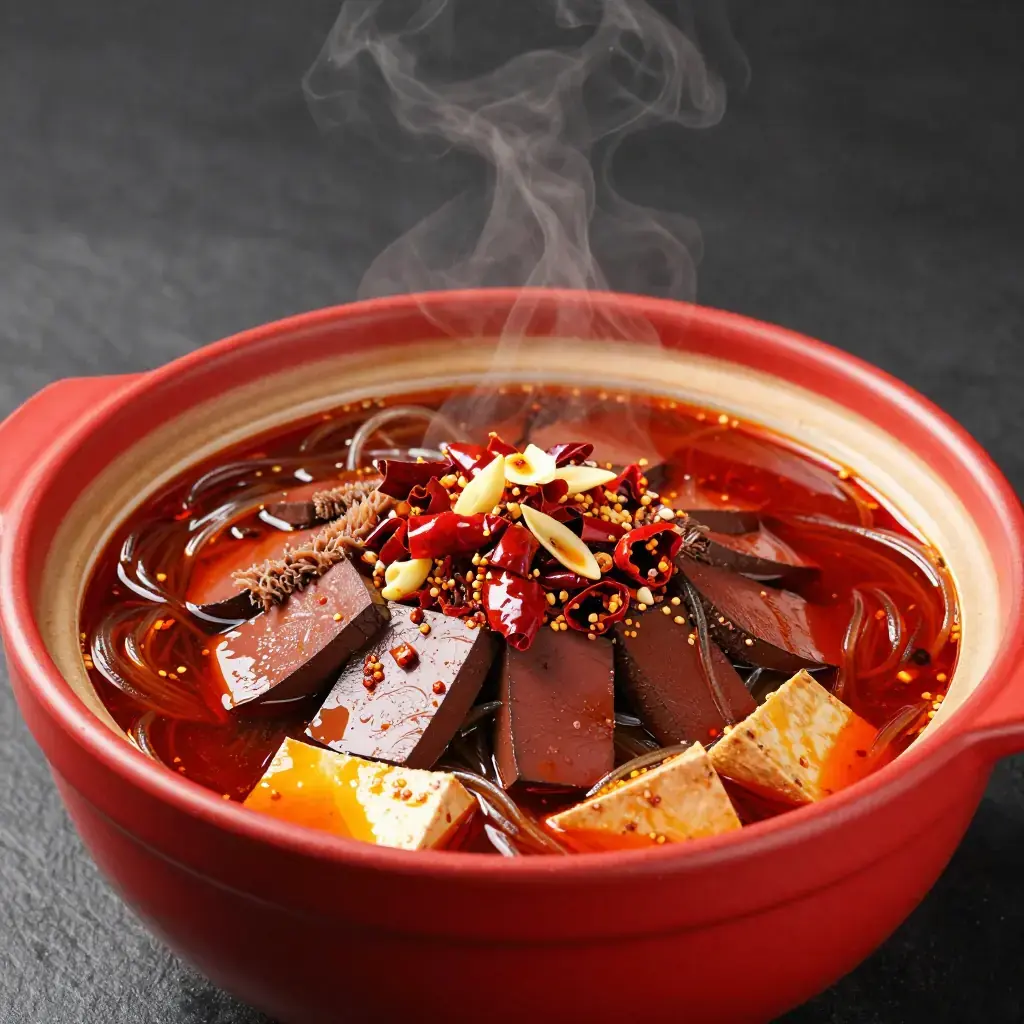 Mao Xuewang originates from Shapingba in Chongqing and is now beloved across all of China — a dramatically red, deeply numbing pot of duck blood curd, tripe, tofu, bean sprouts, and glass noodles submerged in mala chili oil broth and finished with a sizzling pour of hot oil over dried chiles and garlic. It is unapologetically bold and richly satisfying.