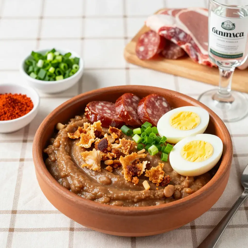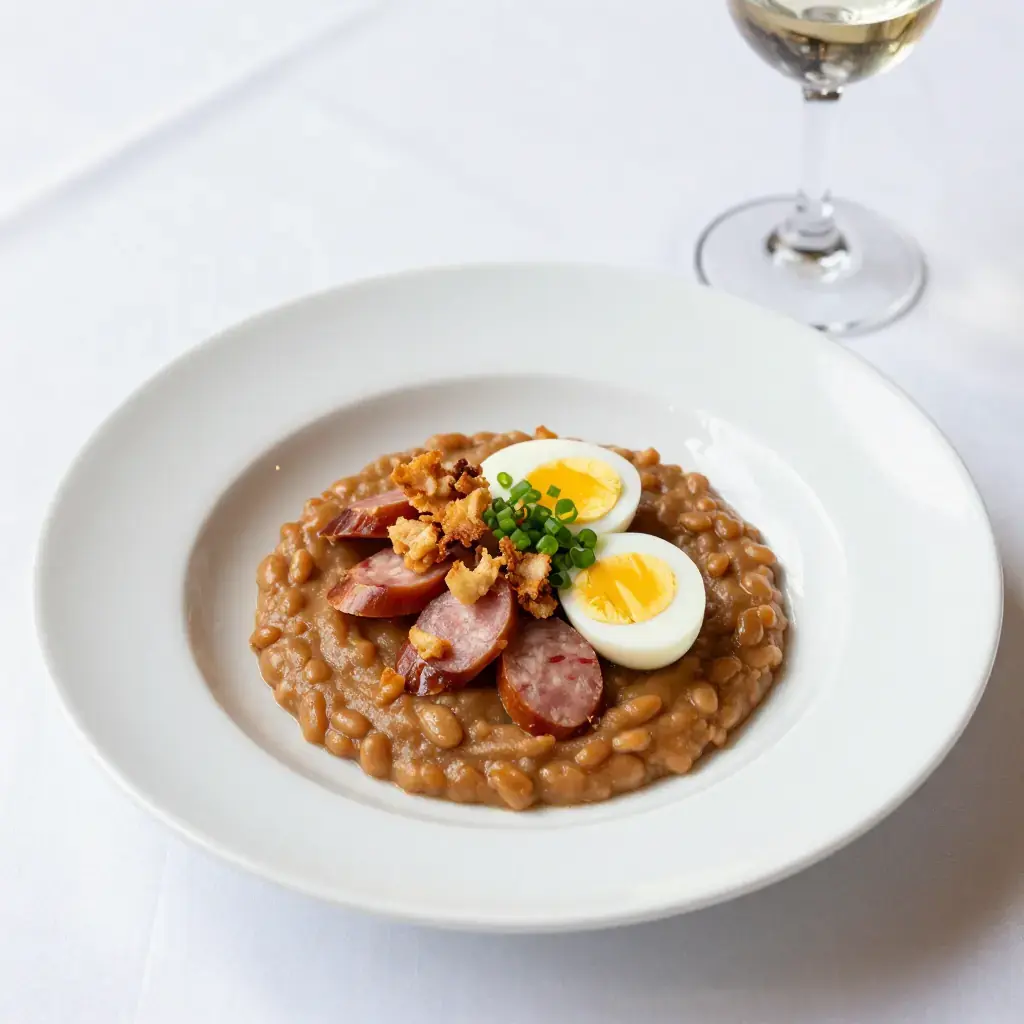 # Tutu à Mineira (Tutu de Feijão) Tutu à Mineira is the soul of Minas Gerais cooking: carioca beans simmered to a thick purée, thickened further with toasted cassava or maize flour until they hold the drag of a spoon, then anointed with a sizzling torresmo (crispy pork skin crackling) and slices of linguiça sausage. The name tutu is said to derive from a Bantu word meaning porridge or paste, a reminder of the deep African imprint on Mineiro food. It is the quintessential Saturday lunch side dish, potluck staple, and comfort food of Brazil's highlands. Serves: 4 ## Ingredients - 400g (14 oz / 2 cups) dried carioca (pinto) beans, soaked overnight - 1 head garlic, 6 cloves smashed, remainder kept whole - 1 medium onion, quartered - 2 bay leaves - Salt to taste - 3 tbsp (45g) cassava flour (farinha de mandioca) or fine maize flour - 2 tbsp neutral oil or lard - 1 tsp sweet paprika **Toppings** - 200g (7 oz) pork belly skin (or store-bought torresmo/pork crackling) - 200g (7 oz) linguiça or smoked pork sausage, sliced - 4 hard-boiled eggs, halved - 4 spring onions, sliced - Handful of flat-leaf parsley, roughly chopped ## Instructions 1. Drain soaked beans. Place in a pressure cooker with the quartered onion, smashed garlic cloves, bay leaves, and cold water to cover by 5 cm (2 inches). Cook under pressure for 25 minutes (or simmer in a regular pot for 75–90 minutes) until beans are very soft. 2. Remove bay leaves. Use an immersion blender or potato masher to purée beans to a smooth-ish paste — a few whole beans add texture. Return to medium heat. 3. Heat oil or lard in a small pan over medium. Add remaining whole garlic cloves; fry until golden, 2–3 minutes. Add paprika; sizzle 30 seconds. Pour garlic oil directly into the bean purée; stir well. 4. Stir cassava flour into the bean purée over low heat, a little at a time, cooking 5–8 minutes until the mixture is thick enough to hold the impression of a spoon dragged through it. Season generously with salt. 5. Meanwhile, fry pork belly skin in a dry pan over high heat until blistered and crispy (15–20 minutes), or use ready-made torresmo. Fry linguiça slices in the same pan, 3–4 minutes per side. 6. Spoon tutu into a wide serving dish. Top with crackling, sausage, hard-boiled eggs, spring onion, and parsley. **Cook's Notes:** Cassava flour is authentic — it absorbs moisture and thickens with a slightly gritty, satisfying texture unlike cornstarch. Do not add the flour too quickly or the tutu seizes. Leftovers thicken further overnight; thin with warm water when reheating.Images