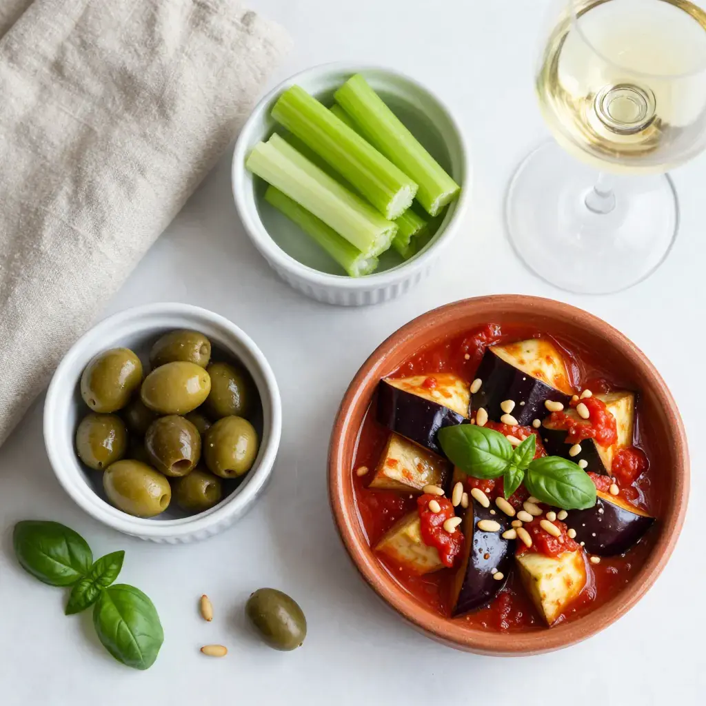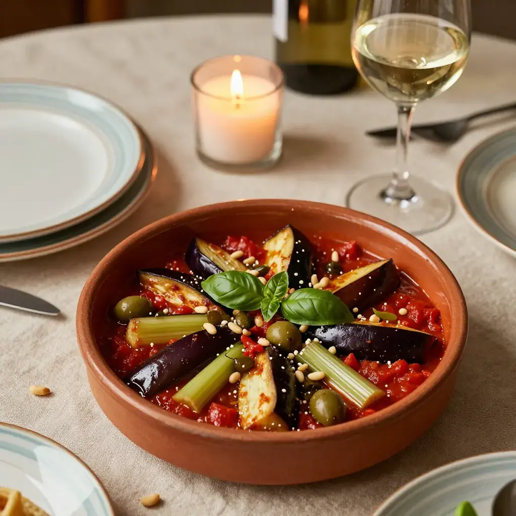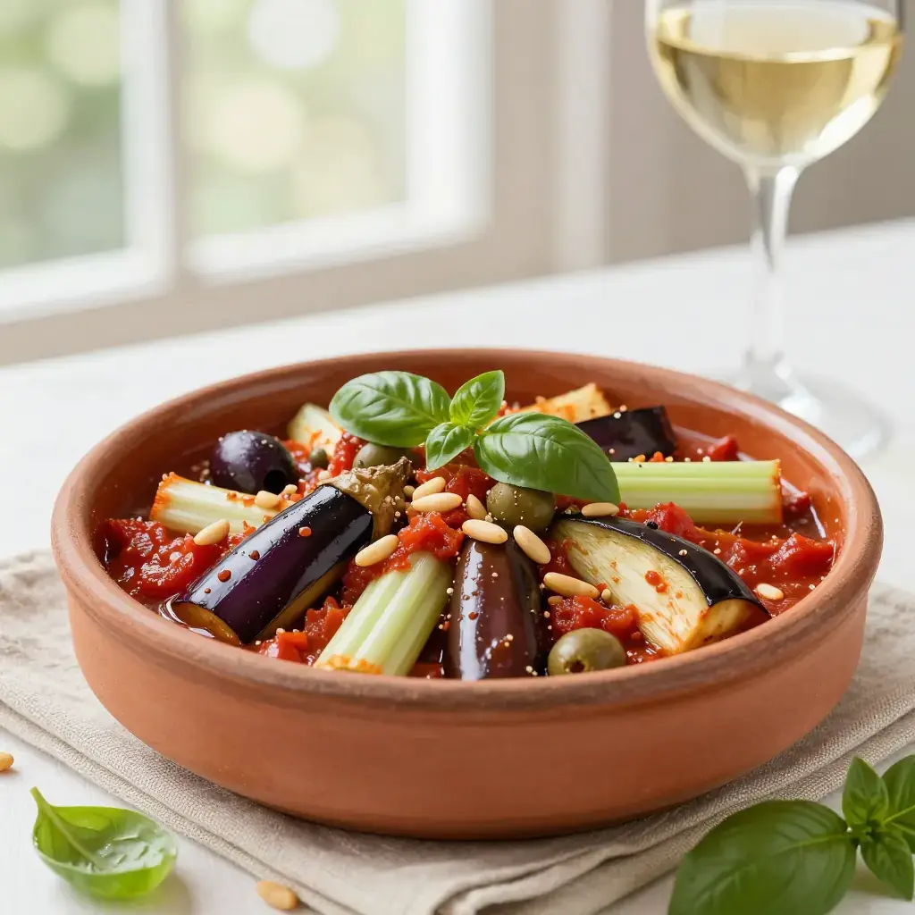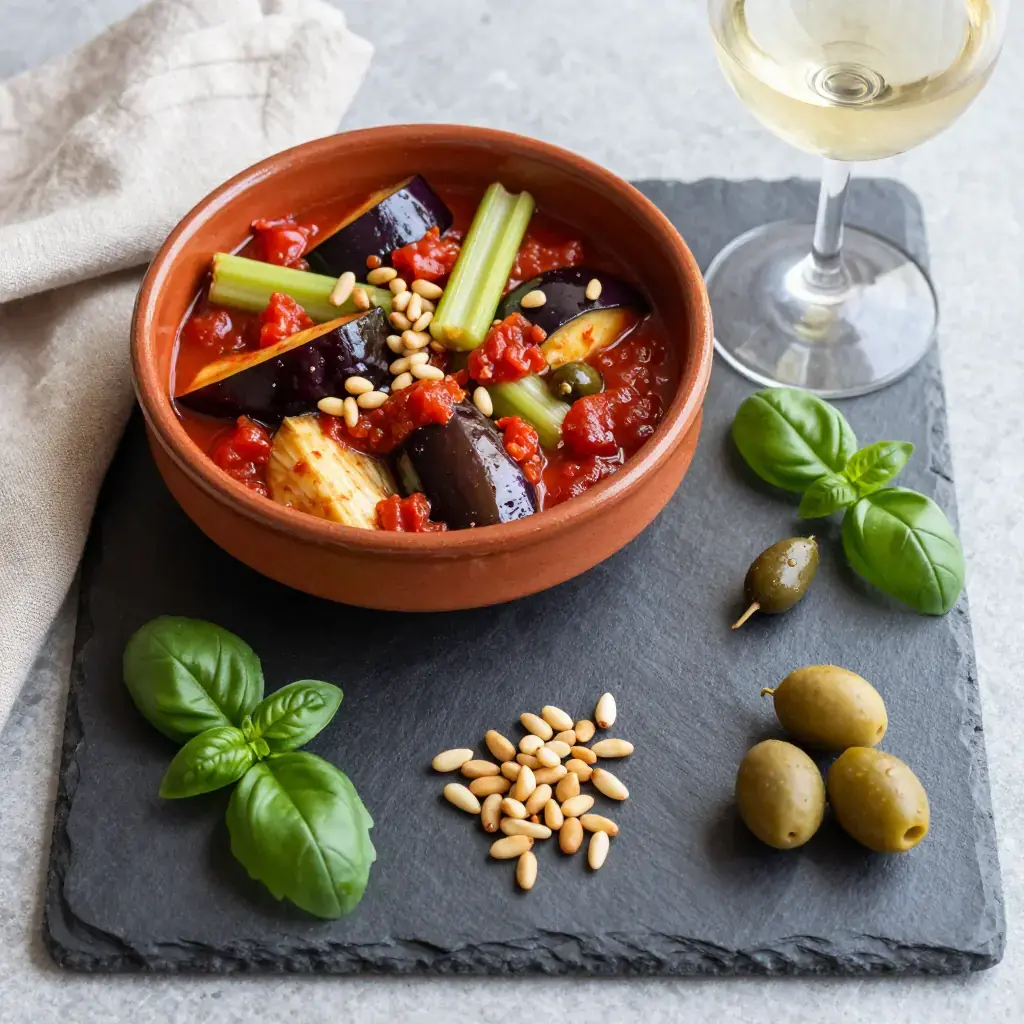 Caponata is the great room-temperature dish of Sicily, a sweet-sour (agrodolce) relish of fried aubergine, celery, capers, olives, and tomatoes that improves enormously the longer it sits. There are dozens of versions across the island — Palermo's includes pine nuts and raisins, Catania's sometimes adds fish — but all share that characteristic tension between sugar and vinegar that characterises Arab-influenced Sicilian cuisine. It is eaten at room temperature as an antipasto, a condiment, or a lunch spread on bread.