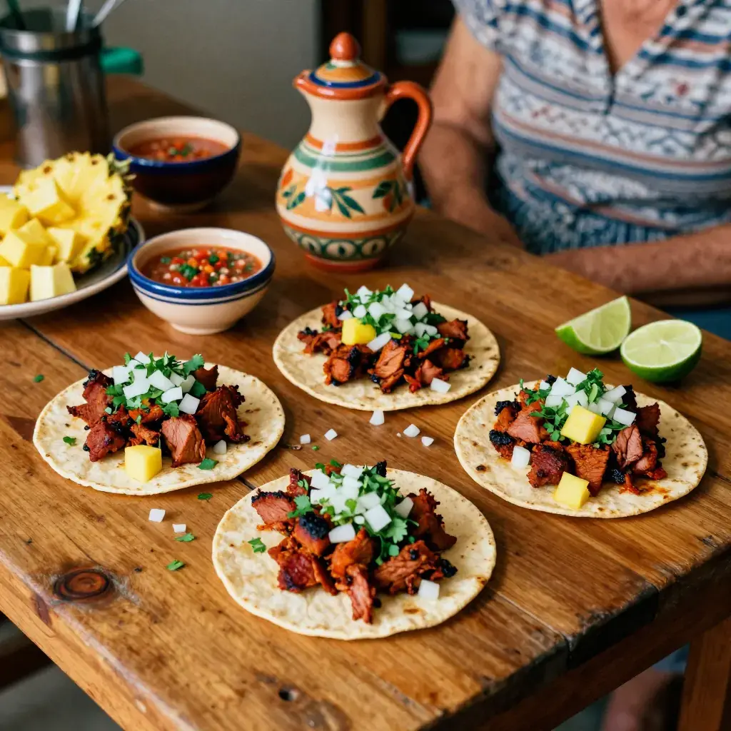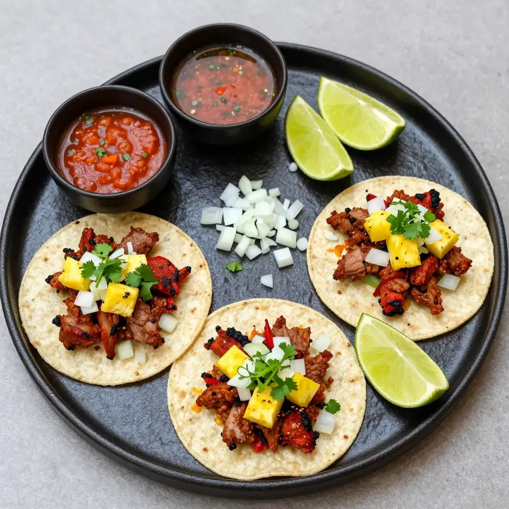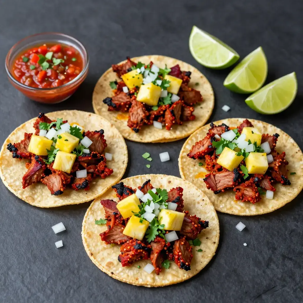 # Tacos al Pastor Tacos al pastor trace their lineage directly to Lebanese immigrants who brought shawarma to Mexico City in the early twentieth century. Pork replaced lamb, achiote and dried chillies replaced Middle Eastern spices, and a pineapple was affixed to the top of the vertical spit — but the technique remained. Today al pastor is the undisputed king of Mexico City street food, the trompo (spit) turning outside every taqueria from midnight until dawn. Grilling a marinated pork shoulder at home over charcoal comes close to the original. Serves: 6 ## Ingredients **For the marinade:** - 1kg (2¼ lb) pork shoulder, sliced 5mm (¼ inch) thick - 3 dried guajillo chillies, stemmed and seeded - 2 dried ancho chillies, stemmed and seeded - 3 cloves garlic - 60ml (4 tbsp) pineapple juice - 2 tbsp achiote (annatto) paste - 1 tbsp apple cider vinegar - 1 tsp dried oregano - 1 tsp ground cumin - ½ tsp ground cloves - 1 tsp salt **To serve:** - 150g (5 oz) fresh pineapple, cut into 1cm cubes - 1 white onion, finely diced - Fresh coriander, chopped - Small corn tortillas, warmed - Salsa verde or salsa roja - Lime wedges ## Instructions 1. Toast guajillo and ancho chillies in a dry pan for 30 seconds per side until fragrant. Soak in hot water for 15 minutes until soft. 2. Drain chillies and blend with garlic, pineapple juice, achiote paste, vinegar, oregano, cumin, cloves, and salt into a smooth paste. 3. Toss sliced pork with marinade, ensuring every piece is coated. Marinate for at least 4 hours, ideally overnight in the refrigerator. 4. Light a charcoal grill to high heat. Grill pork slices for 2–3 minutes per side until lightly charred and cooked through. Alternatively, cook in batches in a very hot cast-iron pan. 5. Roughly chop the grilled pork into small pieces. Warm corn tortillas directly over a flame for 15–20 seconds per side. 6. Assemble tacos: pile pork on tortillas, add pineapple, diced onion, and fresh coriander. Squeeze lime juice over each taco and serve with salsa. **Cook's Notes:** The char is non-negotiable — al pastor needs high heat and some scorching on the edges. Marinating overnight is strongly recommended. If achiote paste is unavailable, substitute with 1½ tsp ground annatto, ½ tsp paprika, and ½ tsp orange juice.Images