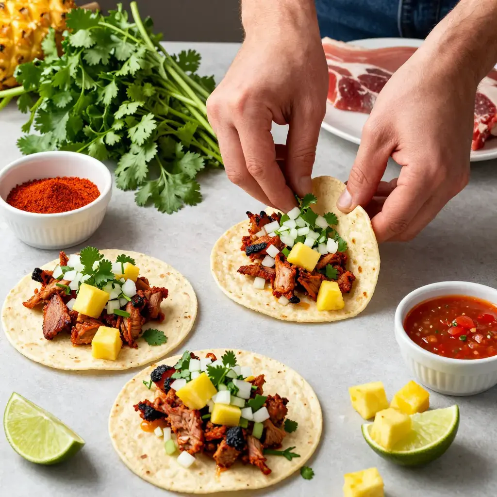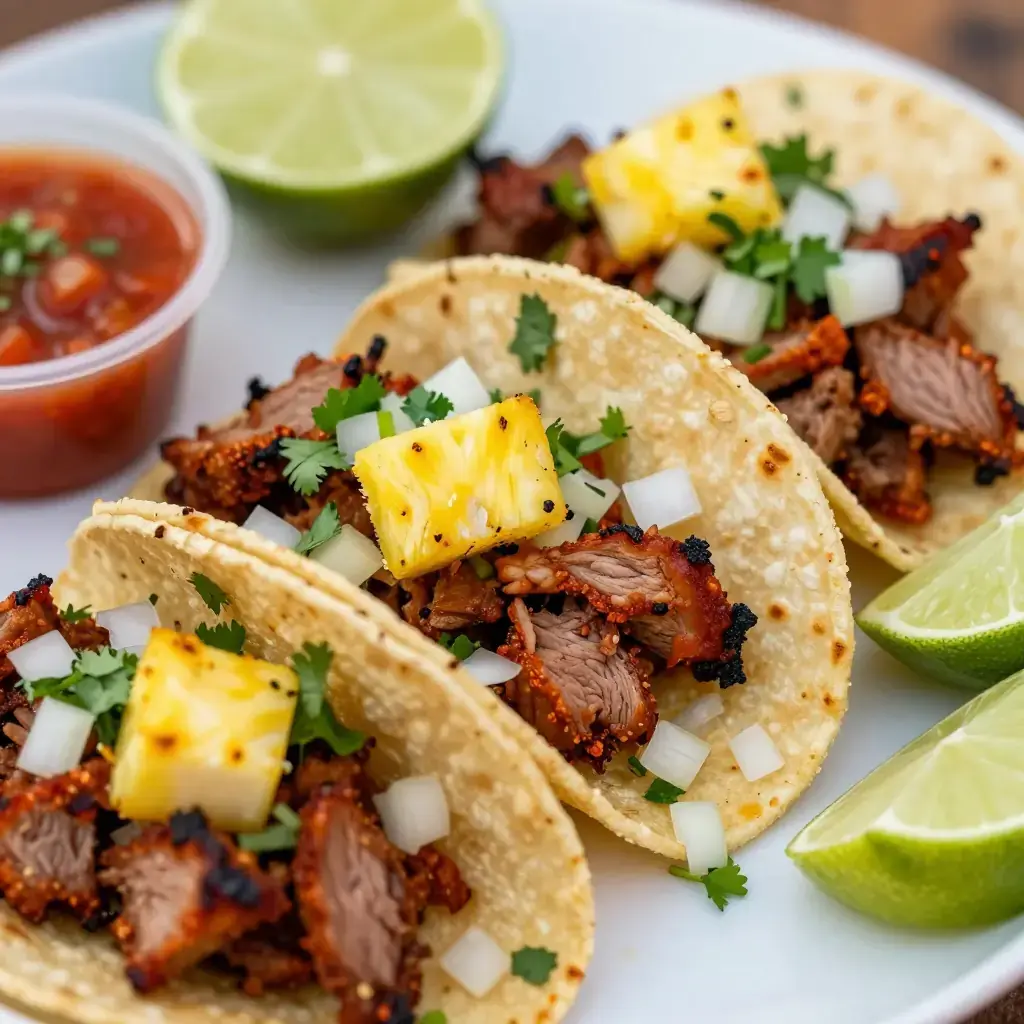 Cook's Notes: The char is non-negotiable — al pastor needs high heat and some scorching on the edges. Marinating overnight is strongly recommended. If achiote paste is unavailable, substitute with 1½ tsp ground annatto, ½ tsp paprika, and ½ tsp orange juice.