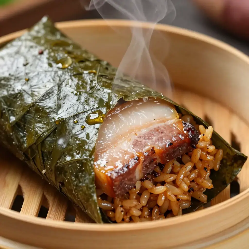 - Fold the lotus leaf edges over the filling to enclose. Steam over vigorously boiling water for 60 to 70 minutes until pork is completely tender.