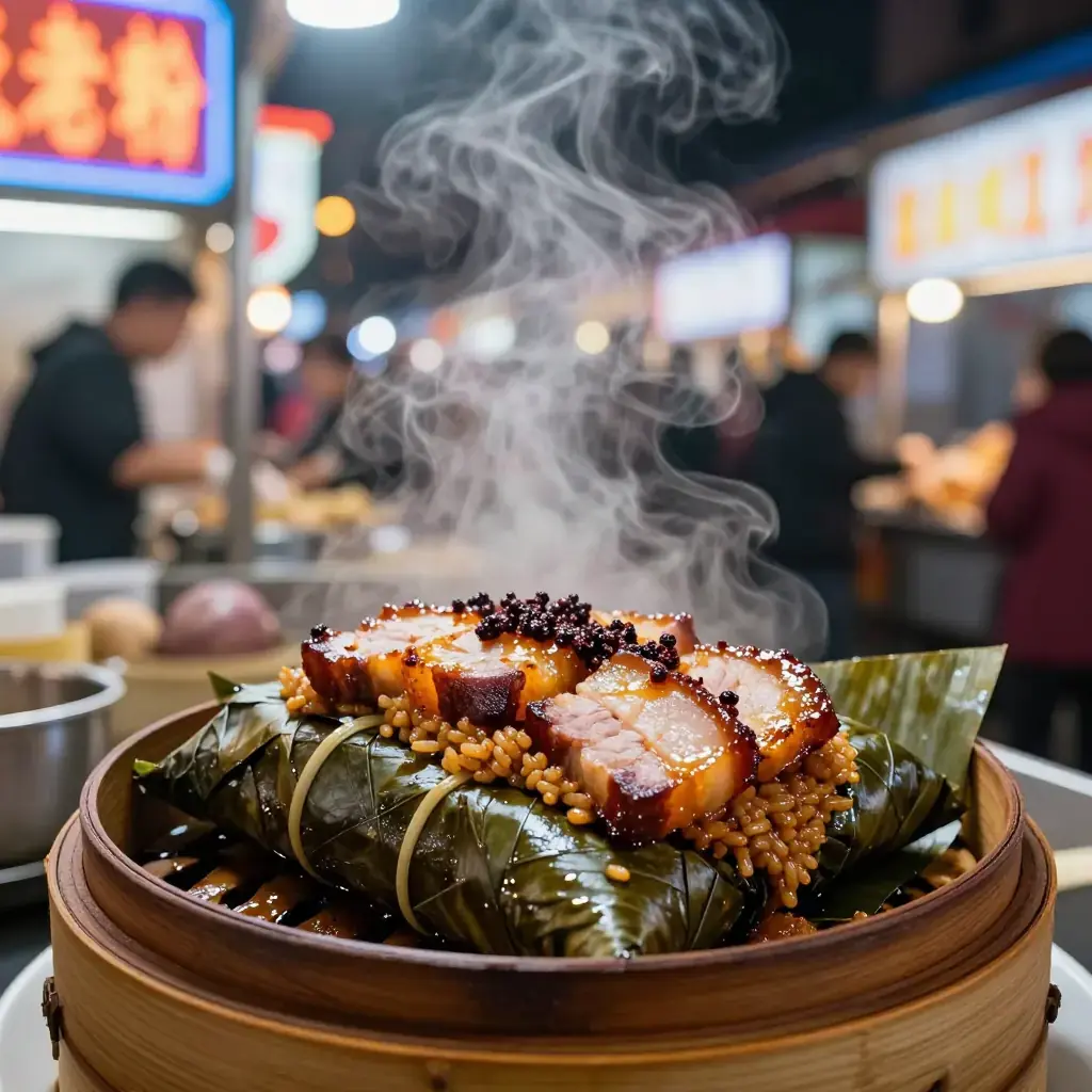 Cook's Notes: Taro is traditional, but sweet potato adds a pleasant sweetness that balances the rich, spiced pork. The ground rice coating absorbs all the rendered fat and marinade during steaming, creating a dense, fragrant crust. Dried lotus leaves are available in Chinese grocery stores.