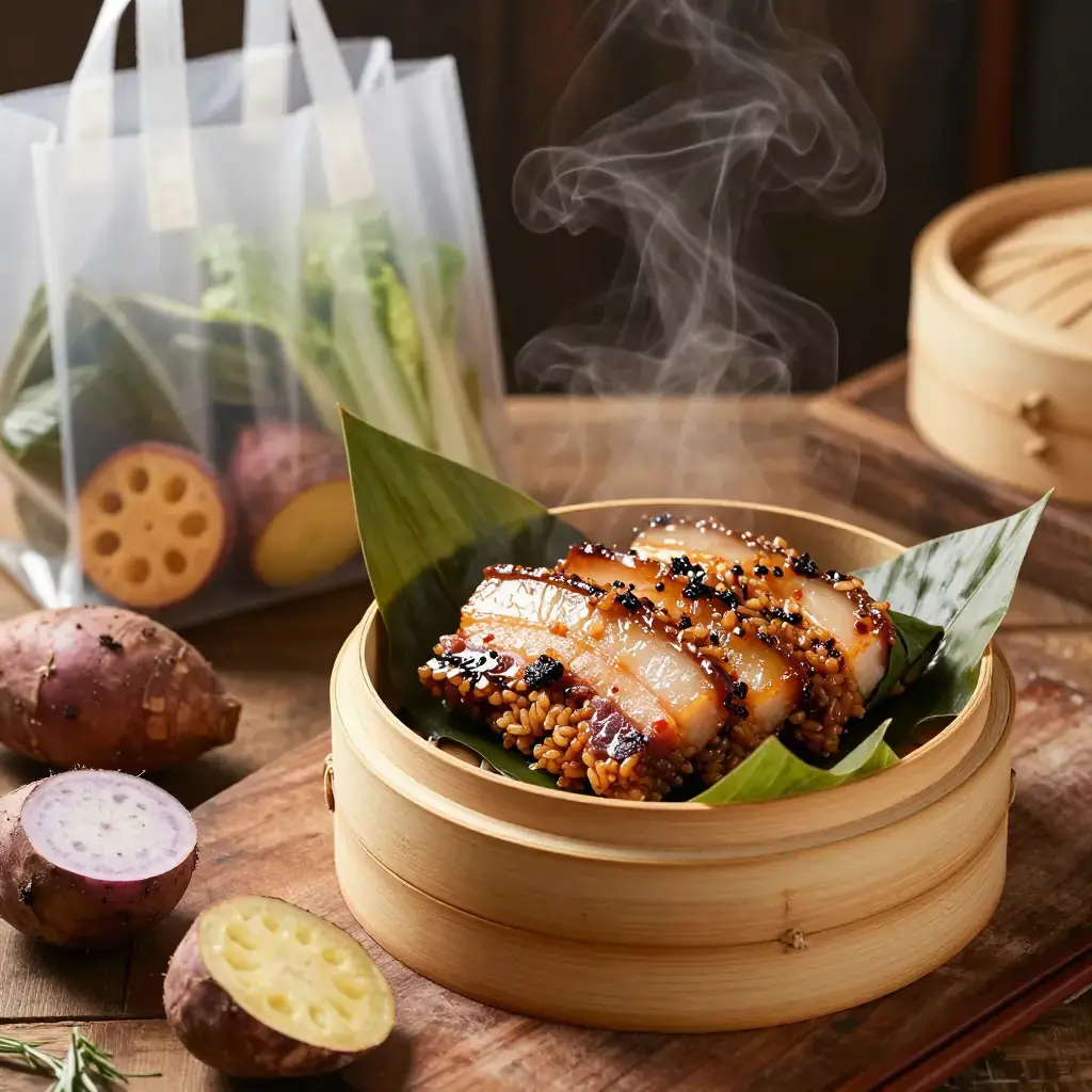 Fen Zheng Rou is one of Hunan's most beloved home-cook dishes — fatty pork belly coated in spiced ground rice, then steamed to silky tenderness on a bed of root vegetables and wrapped in lotus leaf. The lotus leaf imparts a haunting floral fragrance that perfumes both the pork and the taro or sweet potato beneath it.