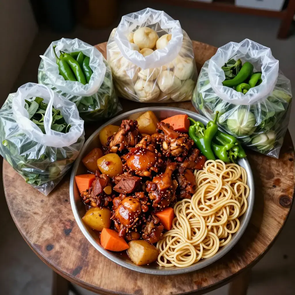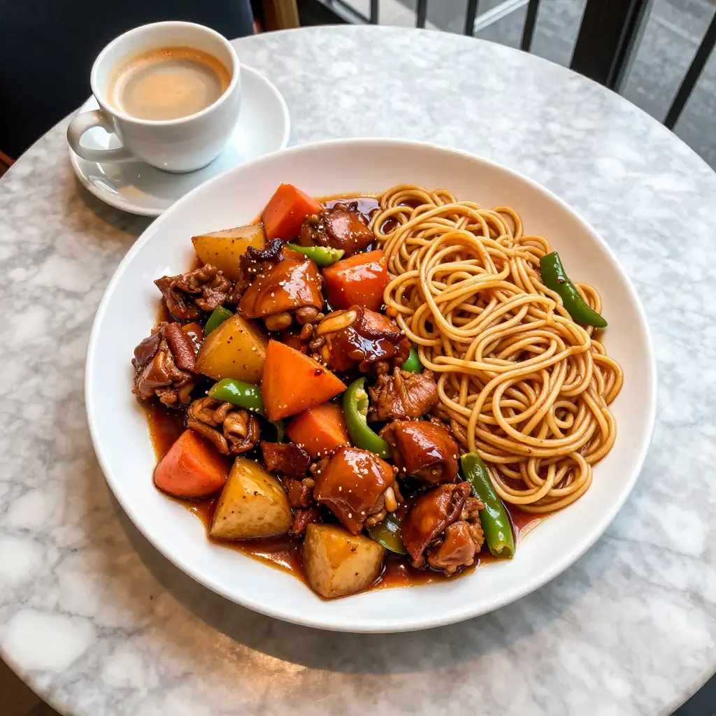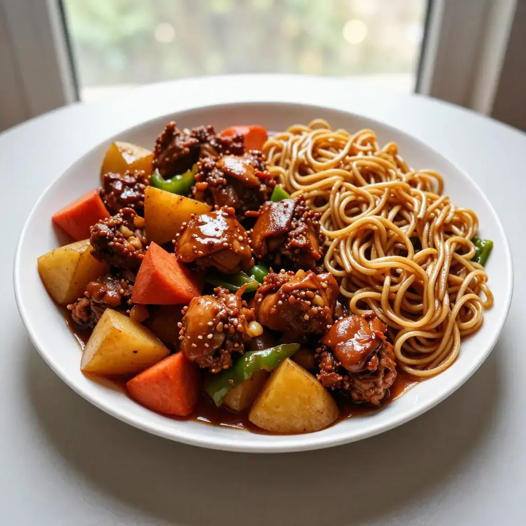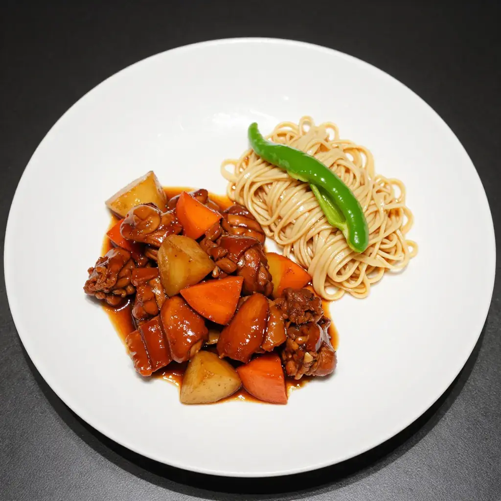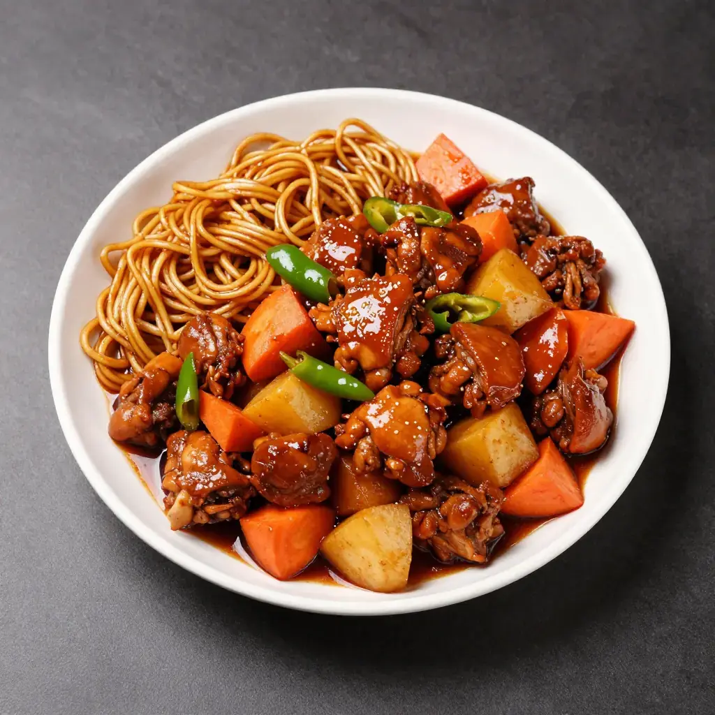 # Dongbei Da Pan Ji Da Pan Ji — literally "big plate chicken" — originated among the Uyghur communities of Xinjiang before spreading across northern China and becoming a cornerstone of Dongbei comfort cooking. A whole chicken is braised in a rich, brick-red sauce of tomato, potato, and aromatic spices, then presented in a comically large shallow platter with thick belt noodles piled alongside to soak up the sauce. Serves: 6 ## Ingredients - 1.5 kg (3.3 lb) whole chicken, cut into 5 cm (2-inch) bone-in pieces - 3 tbsp (45ml) vegetable oil - 4 tbsp (60ml) Shaoxing rice wine - 2 tbsp (30g) doubanjiang (fermented chili bean paste) - 3 tbsp (45ml) light soy sauce - 1 tbsp (15ml) dark soy sauce - 1 tbsp (15g) sugar - 3 medium potatoes, about 600g (1.3 lb), peeled and cut into large chunks - 2 medium carrots, sliced thick on the diagonal - 1 large onion, cut into wedges - 1 head garlic, cloves separated and peeled - 30g (1 oz) fresh ginger, sliced - 4 dried red chilies - 2 bay leaves - 1 cinnamon stick - 3 star anise - 600ml (2½ cups) water or chicken stock - 2 medium green bell peppers, cut into large pieces - 400g (14 oz) fresh thick belt noodles (or pappardelle), cooked and drained ## Instructions 1. Heat oil in a large wok or wide pot over high heat. Brown chicken pieces in batches, 3 to 4 minutes per batch, until golden. Transfer to a plate. 2. Reduce heat to medium. Add doubanjiang and stir-fry for 1 minute until oil turns red and fragrant. 3. Add garlic, ginger, dried chilies, bay leaves, cinnamon, and star anise; stir-fry 1 minute. 4. Return chicken to the pot. Add Shaoxing wine and stir to coat. 5. Add soy sauces, sugar, potatoes, carrots, onion, and stock. Bring to a boil, then cover and simmer over medium-low heat for 25 minutes. 6. Add green bell peppers and cook uncovered for a further 8 to 10 minutes until peppers are just tender and sauce has thickened to a rich glaze. 7. Arrange cooked noodles on one side of a very large serving platter. Ladle the chicken and sauce over and alongside the noodles. **Cook's Notes:** The noodles should be added to the platter just before serving and left for diners to mix in themselves, so they do not become too soft. Da Pan Ji is a communal dish — serve it in the center of the table with chopsticks for all.Images