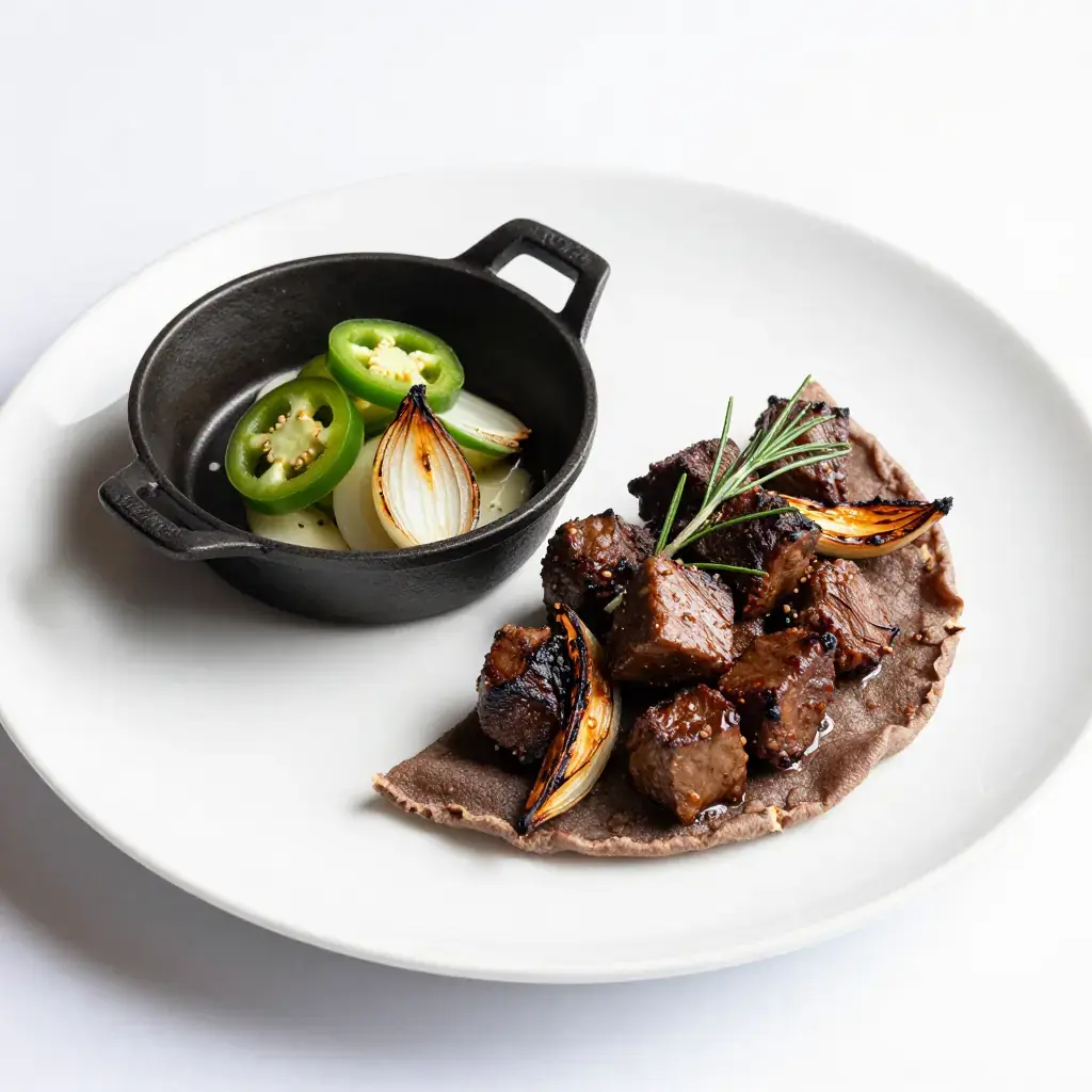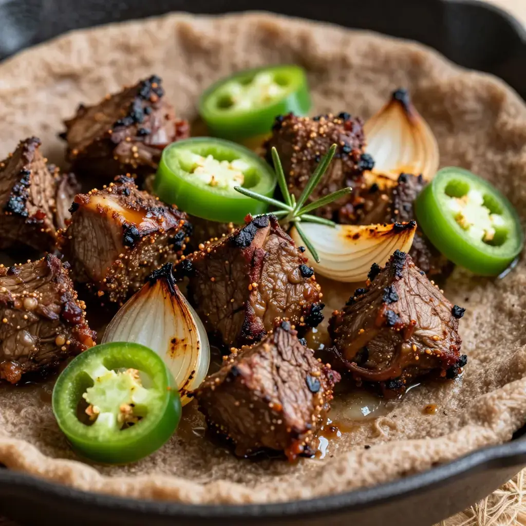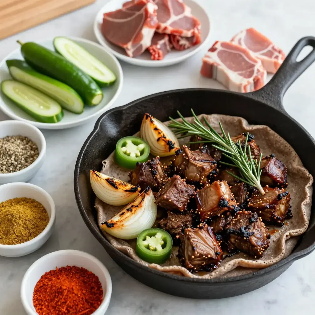 # Ye'beg Tibs Ye'beg tibs is a celebratory Ethiopian lamb sauté reserved for special occasions, feast days, and family gatherings. Cubes of tender lamb are quickly sautéed in spiced clarified butter with onion, jalapeño, and fresh rosemary in a screaming-hot pan — a dish of bold, direct flavour that showcases Ethiopia's revered berbere spice culture. Serves: 4 ## Ingredients - 700g (1.5 lb) bone-in lamb shoulder or leg, cut into 3cm (1¼ in) cubes - 3 tbsp (45g) niter kibbeh (Ethiopian spiced clarified butter) or ghee - 1 large onion, cut into thick wedges - 4 garlic cloves, roughly chopped - 2 jalapeño or serrano chillies, sliced - 2 tsp (6g) berbere spice blend - 1 tsp (3g) ground cumin - 2 sprigs fresh rosemary - 1 tsp (5g) salt - ½ tsp (1g) black pepper - 2 tomatoes, roughly chopped - Fresh injera or crusty bread, to serve ## Instructions 1. Pat lamb cubes dry with paper towels and season with salt and pepper. 2. Heat a large cast iron skillet or heavy pan over high heat until very hot — nearly smoking. Add niter kibbeh and swirl to coat. 3. Add lamb in a single layer (work in batches if needed) and sear without moving 2-3 minutes per side until deeply browned. The high heat and rapid sear is essential. Set browned lamb aside. 4. Reduce heat to medium-high. Add onion wedges and cook 4-5 minutes until charred at the edges. Add garlic, jalapeños, and rosemary; cook 2 minutes. 5. Stir in berbere and cumin; cook 1 minute until fragrant. Add chopped tomato and cook 3 minutes until collapsing. 6. Return lamb to the pan, toss to coat, and cook a further 4-5 minutes until the lamb is cooked through but still slightly pink at the centre. 7. Taste and adjust salt. Serve immediately on a bed of torn injera. **Cook's Notes:** The pan must be genuinely hot before the lamb goes in — this is not a low-and-slow dish. Ye'beg tibs is intentionally bold; for a milder version halve the berbere and omit one chilli.Images