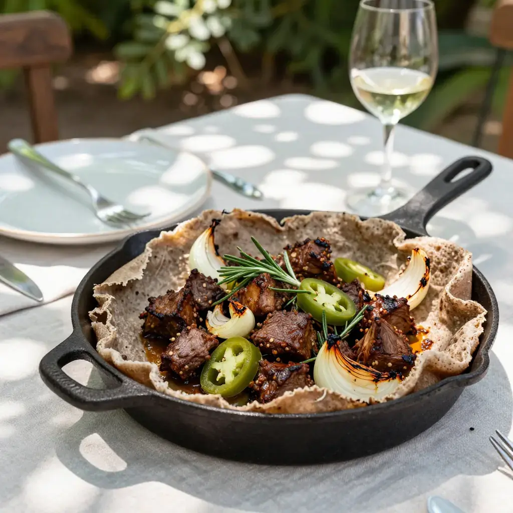 Ye'beg tibs is a celebratory Ethiopian lamb sauté reserved for special occasions, feast days, and family gatherings. Cubes of tender lamb are quickly sautéed in spiced clarified butter with onion, jalapeño, and fresh rosemary in a screaming-hot pan — a dish of bold, direct flavour that showcases Ethiopia's revered berbere spice culture.