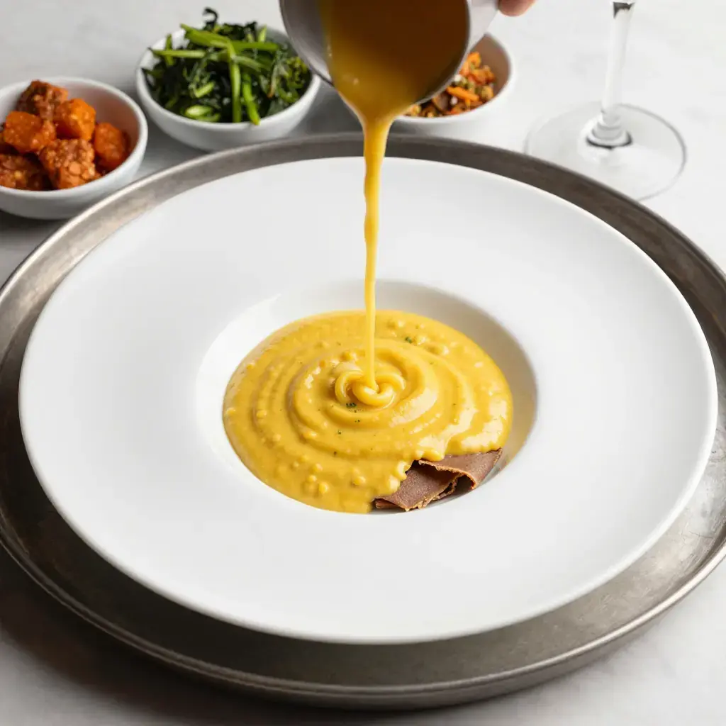 # Ye'misir Kik Alicha Unlike the boldly spiced misir wot made with red lentils and berbere, ye'misir kik alicha is a gentle, golden stew of yellow or red split lentils cooked with turmeric, ginger, and caramelised onion — no chilli heat. It is a staple of the Ethiopian fasting table, appearing as part of the yetsom beyaynetu platter and eaten daily in many homes during fasting periods. Serves: 4 ## Ingredients - 300g (1½ cups) red or yellow split lentils, rinsed - 3 tbsp (45ml) vegetable oil - 2 large onions, finely diced - 4 garlic cloves, minced - 1 tbsp (10g) fresh ginger, grated - 1½ tsp (4g) ground turmeric - 1 tsp (3g) ground cumin - 1 tsp (5g) salt - 900ml (3¾ cups) water - Fresh injera, to serve ## Instructions 1. Heat oil in a heavy saucepan over medium heat. Add onions and cook slowly, stirring occasionally, 15-18 minutes until deep golden and very soft. This slow caramelisation is the foundation of the stew's sweetness. 2. Add garlic and ginger; cook 2 minutes. Stir in turmeric and cumin; cook 1 minute until fragrant. 3. Add rinsed lentils and water. Stir well, bring to a boil, then reduce heat to low. 4. Simmer uncovered, stirring frequently to prevent sticking, 25-30 minutes until the lentils have completely dissolved into a thick, smooth stew. 5. Add salt, taste, and adjust seasoning. The stew should be pourable but thick enough to mound gently on injera. 6. Serve warm on injera as part of a fasting platter or alongside other Ethiopian dishes. **Cook's Notes:** The key to alicha (mild stew) is patience with the onions — they must be properly caramelised before adding anything else. This stew thickens significantly as it cools; thin with a splash of water when reheating.Images