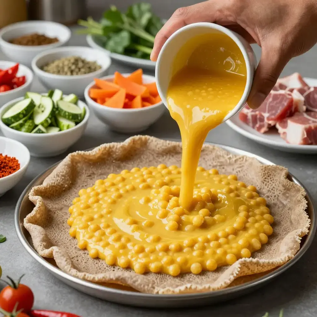 - Add salt, taste, and adjust seasoning. The stew should be pourable but thick enough to mound gently on injera.