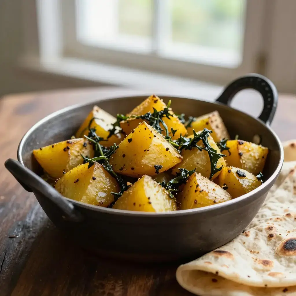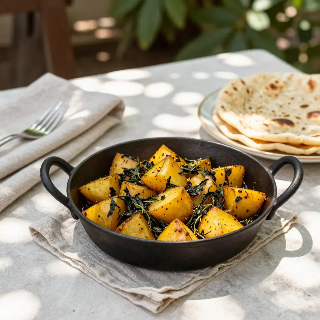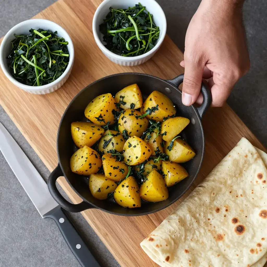 Aloo methi is a simple, beloved dry-fry from the kitchens of Punjab and Uttar Pradesh, made when fresh methi (fenugreek) leaves appear in winter markets. The slight bitterness of fenugreek mellows with cooking and melds beautifully with spiced potatoes — a dish that is unpretentious, nourishing, and deeply satisfying.