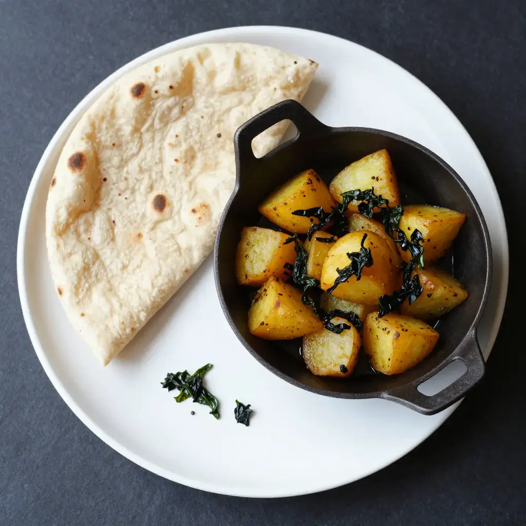 # Aloo Methi Aloo methi is a simple, beloved dry-fry from the kitchens of Punjab and Uttar Pradesh, made when fresh methi (fenugreek) leaves appear in winter markets. The slight bitterness of fenugreek mellows with cooking and melds beautifully with spiced potatoes — a dish that is unpretentious, nourishing, and deeply satisfying. Serves: 4 ## Ingredients - 500g (1 lb) waxy potatoes, peeled and cut into 2cm (¾ in) cubes - 200g (7 oz) fresh fenugreek (methi) leaves, washed and roughly chopped (or 3 tbsp dried kasuri methi) - 3 tbsp (45ml) mustard oil or neutral vegetable oil - 1 tsp (4g) cumin seeds - ½ tsp (2g) carom seeds (ajwain), optional - 3 garlic cloves, minced - 1 tsp (3g) ground coriander - ½ tsp (1g) ground turmeric - ½ tsp (1g) red chilli powder - 1 tsp (5g) salt - Chapati or paratha, to serve ## Instructions 1. If using fresh fenugreek, sprinkle with a little salt, leave 5 minutes, then squeeze out excess moisture. This reduces bitterness. 2. Heat oil in a heavy kadhai or wide pan over medium-high heat. If using mustard oil, heat until it just begins to smoke, then reduce heat — this removes the raw pungency. 3. Add cumin and ajwain seeds; let sizzle 20-30 seconds until fragrant. Add garlic and fry 1 minute. 4. Add potatoes and stir to coat in the tempered oil. Sprinkle over coriander, turmeric, chilli powder, and salt. Toss well. 5. Cover and cook over medium heat 10-12 minutes, stirring every 3-4 minutes, until potatoes are nearly tender. 6. Add the prepared fenugreek leaves and stir through. Cook uncovered 5-6 minutes until the leaves wilt completely and the potatoes are fully cooked with slightly crisped edges. 7. Taste and adjust salt. Serve with chapati or as a side alongside dal. **Cook's Notes:** Fresh methi has a pleasant bitterness that is quite different from dried kasuri methi. If fresh is unavailable, dried works well — add it at the same stage but reduce quantity to 2 tbsp as it is more concentrated.Images