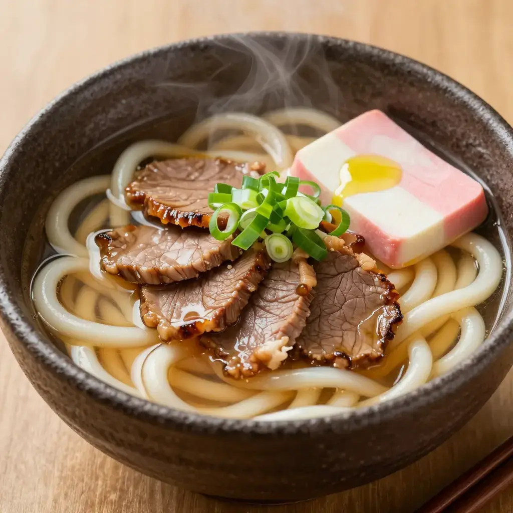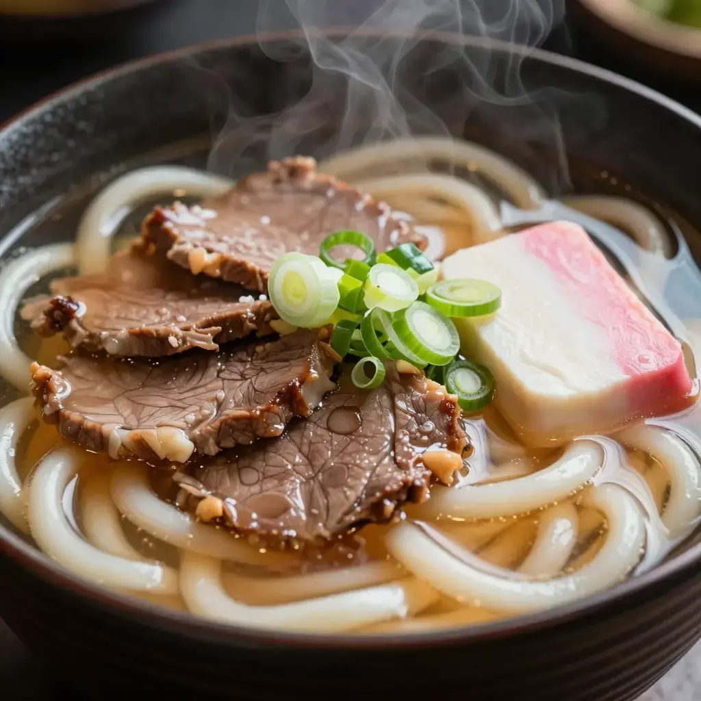 Niku Udon — "meat udon" — is a cornerstone of Osaka's udon culture, featuring thick, chewy wheat noodles in a delicate dashi broth topped with a sweet-savoury braised beef. It is the definitive comfort dish of Kansai, where the lighter, kelp-forward dashi contrasts with the rich, soy-glazed beef.
