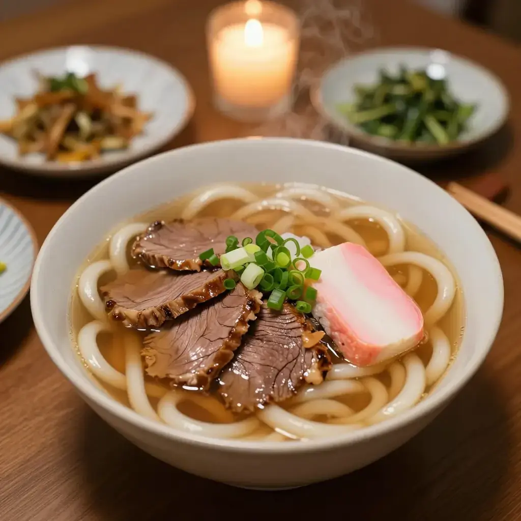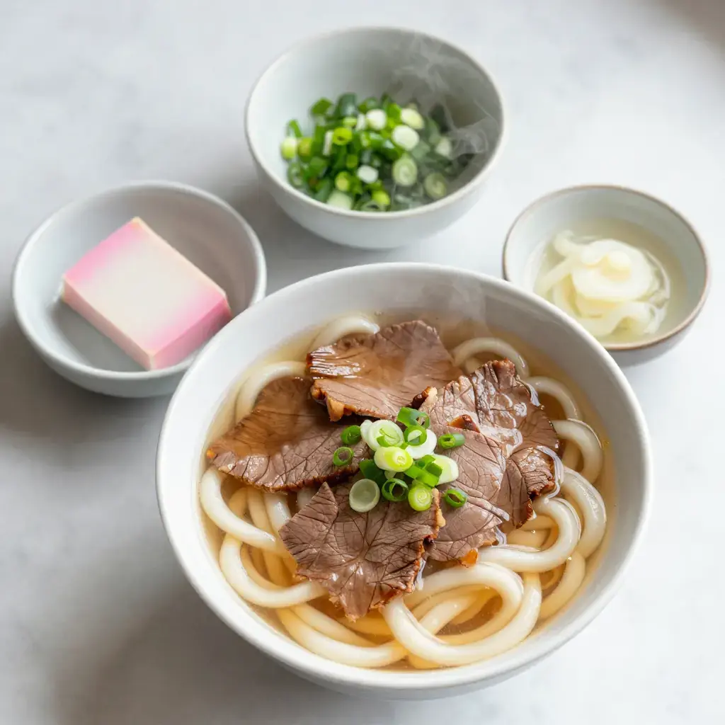 # Niku Udon (肉うどん) Niku Udon — "meat udon" — is a cornerstone of Osaka's udon culture, featuring thick, chewy wheat noodles in a delicate dashi broth topped with a sweet-savoury braised beef. It is the definitive comfort dish of Kansai, where the lighter, kelp-forward dashi contrasts with the rich, soy-glazed beef. Serves: 4 ## Ingredients **Broth:** - 1.5 litres (6 cups) water - 20 g (¾ oz) kombu (dried kelp) - 25 g (1 oz) katsuobushi (bonito flakes) - 3 tbsp (45 ml) light soy sauce (usukuchi preferred) - 2 tbsp (30 ml) mirin - 1 tsp (5 g) salt **Beef topping:** - 300 g (10 oz) thinly sliced beef ribeye or sirloin - 3 tbsp (45 ml) soy sauce - 2 tbsp (30 ml) mirin - 1 tbsp (12 g) sugar - 100 ml (⅓ cup) water **To serve:** - 4 portions (800 g / 28 oz total) fresh or parboiled udon noodles - 4 spring onions (scallions), finely sliced - Shichimi togarashi (seven-spice blend), to taste - Kamaboko fish cake slices (optional) ## Instructions 1. Make the dashi: Place kombu in cold water and bring slowly to 60°C (140°F) over medium-low heat — about 20 minutes. Remove kombu just before boiling. Increase heat, bring to a rolling boil, add katsuobushi, and immediately remove from heat. Steep 5 minutes, then strain. 2. Season dashi with light soy sauce, mirin, and salt. Taste — it should be savoury, slightly sweet, and light in colour. 3. Braise the beef: Simmer soy sauce, mirin, sugar, and water in a small pan. Add beef slices, cook over medium heat 4–5 minutes until the sauce is absorbed and the beef is glossy. 4. Cook udon noodles according to package instructions (fresh: 2–3 minutes; dried: 8–10 minutes). Drain and rinse briefly. 5. Ladle hot broth into deep bowls, add noodles, and top with braised beef, sliced spring onion, and fish cake if using. Finish with shichimi to taste. **Cook's Notes:** Usukuchi (light) soy sauce is lighter in colour and saltier than regular soy — it keeps the broth a beautiful pale gold. For a midnight meal, use frozen udon noodles, which cook in 60 seconds in boiling water.Images