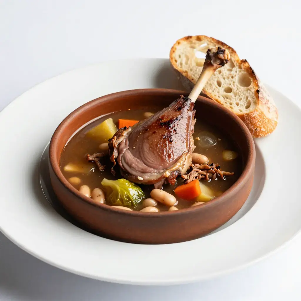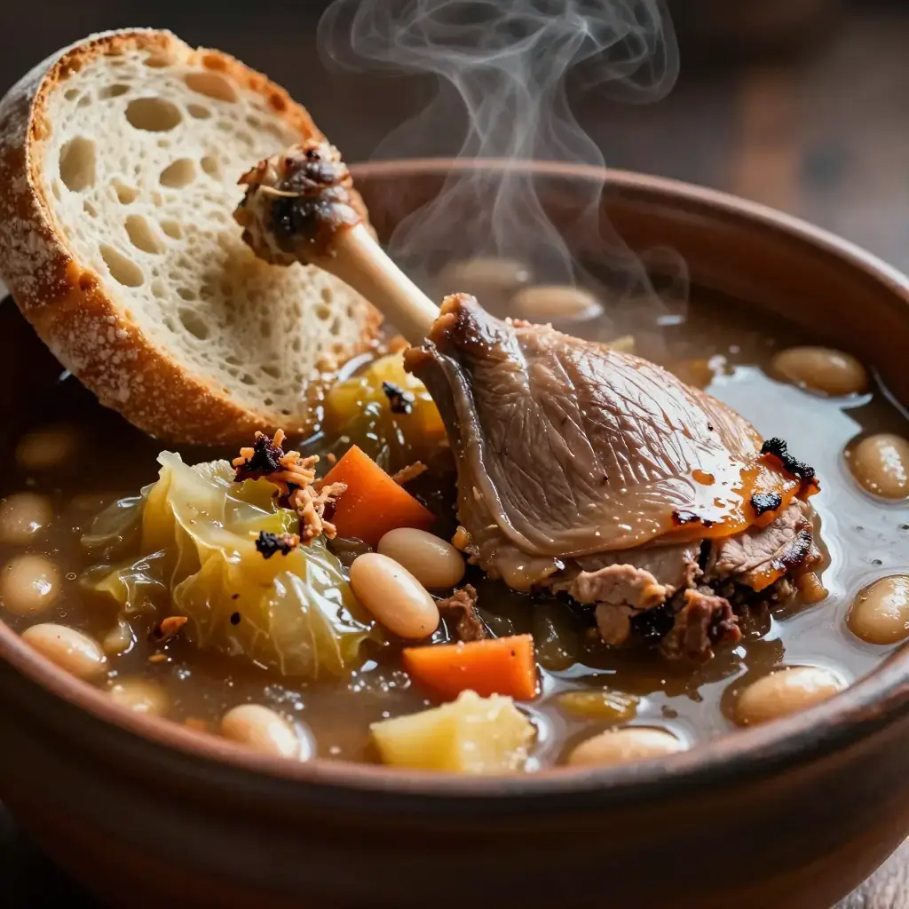 Garbure is the great peasant soup of Gascony in south-west France — a thick, smoky, deeply nourishing broth of cabbage, white beans, and preserved meats that is considered by many Gascons to be the region's soul food. Traditionally so thick a spoon should stand upright in it, the soup improves remarkably with reheating.